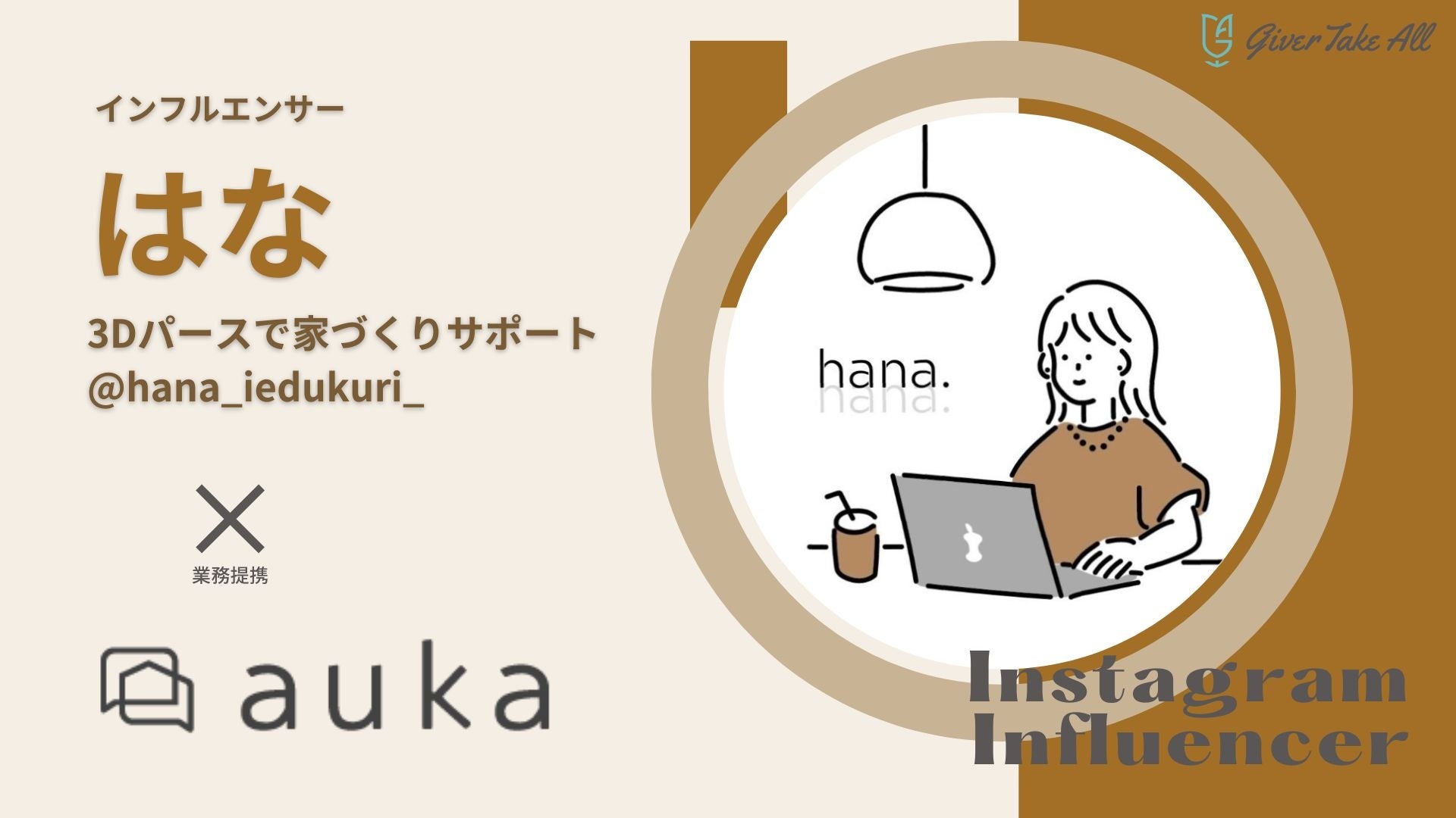住宅購入検討者と住宅メーカーのマッチングプラットフォーム《auka(アウカ)》を運営するギバーテイクオール株式会社(本社:東京都港区、代表取締役CEO 河野清博、以下当社)は、インスタグラムで大注目の住宅系インフルエンサーであるはな様と業務提携を行いました。