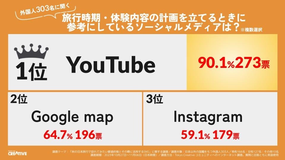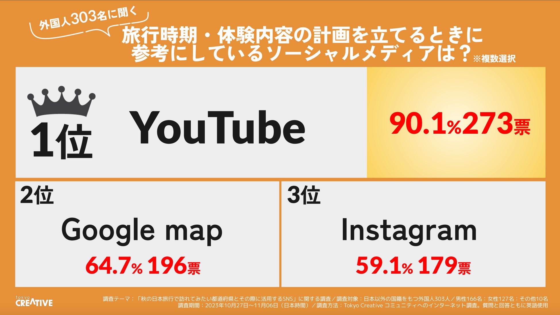 あわせて、旅行時期・体験内容の計画を立てるときに参考にしているソーシャルメディアを調査すると、約9割の90.1%(273票)が「YouTube」と回答。ついで「Google map」64.7%(196票)、そして「Instagram」59.1%(179票)となり、YouTubeが約100票の差をつけて1位となりました。他のSNSと比較しても長尺でコンテンツ内の情報量が多いため、その土地の魅力をより正確に理解するためには最適と考える人が多いからではないかと考えられます。