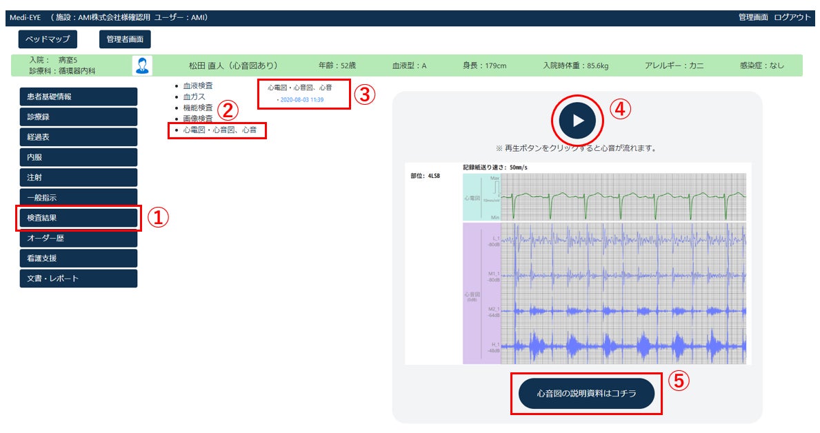①「検査結果」、②「心電図・心音図、心音」をクリックし、③「日時を選択」すると、④「音声・結果レポート」の表示再生が可能です。