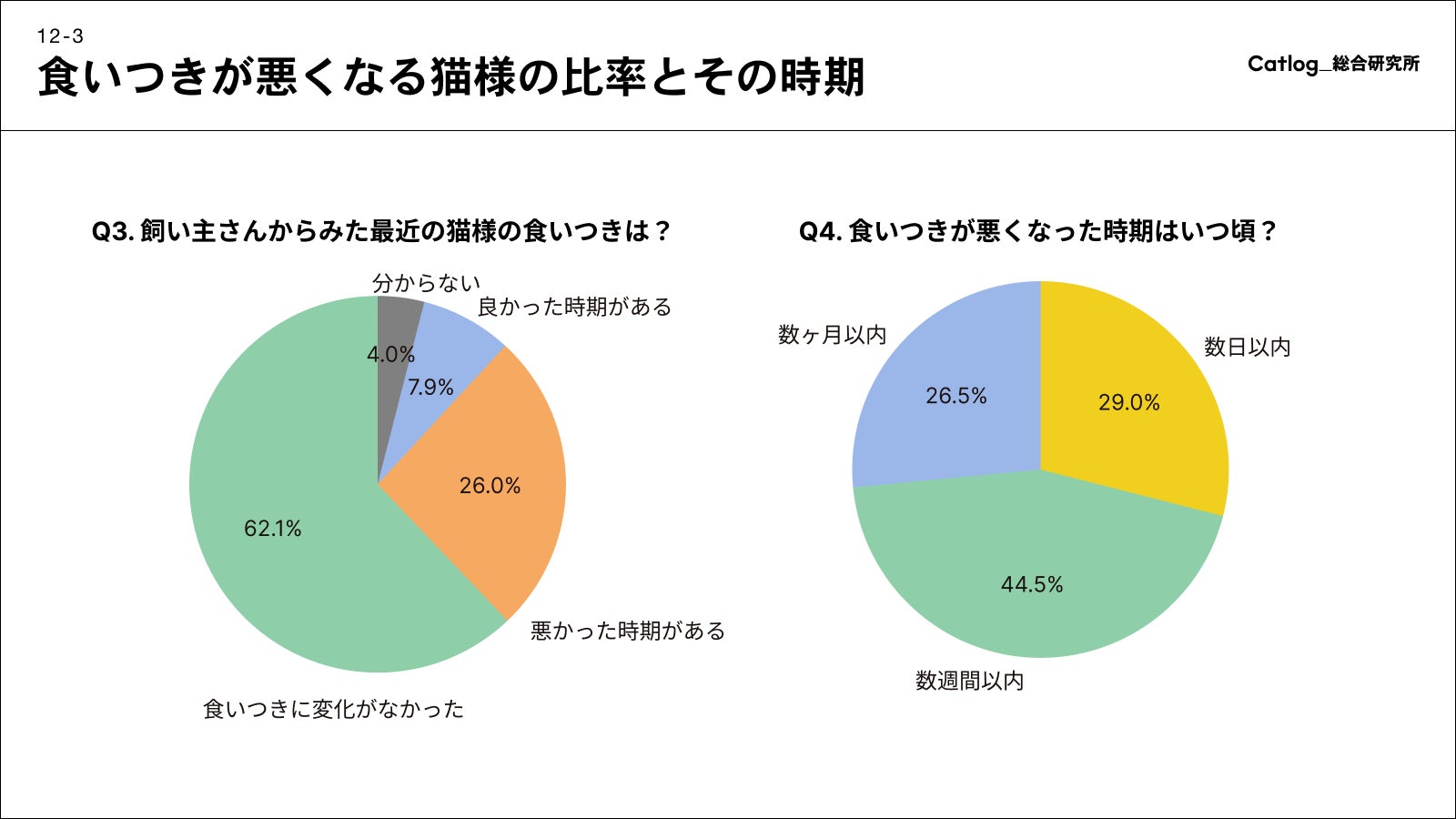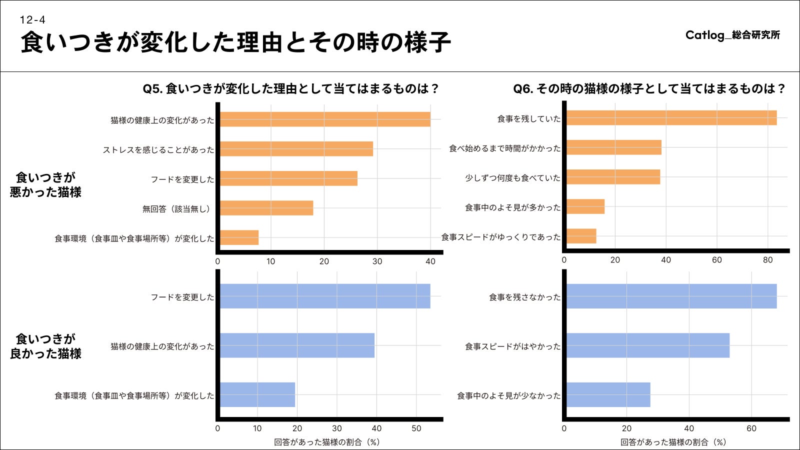 これらの猫様について、直近数週間から数ヶ月間での飼い主さんから見た猫様の食いつきについてお伺いしました(図12-3左)。具体的には、以下のような変化が猫様に見られた場合に、食いつきの変化があったとしています。