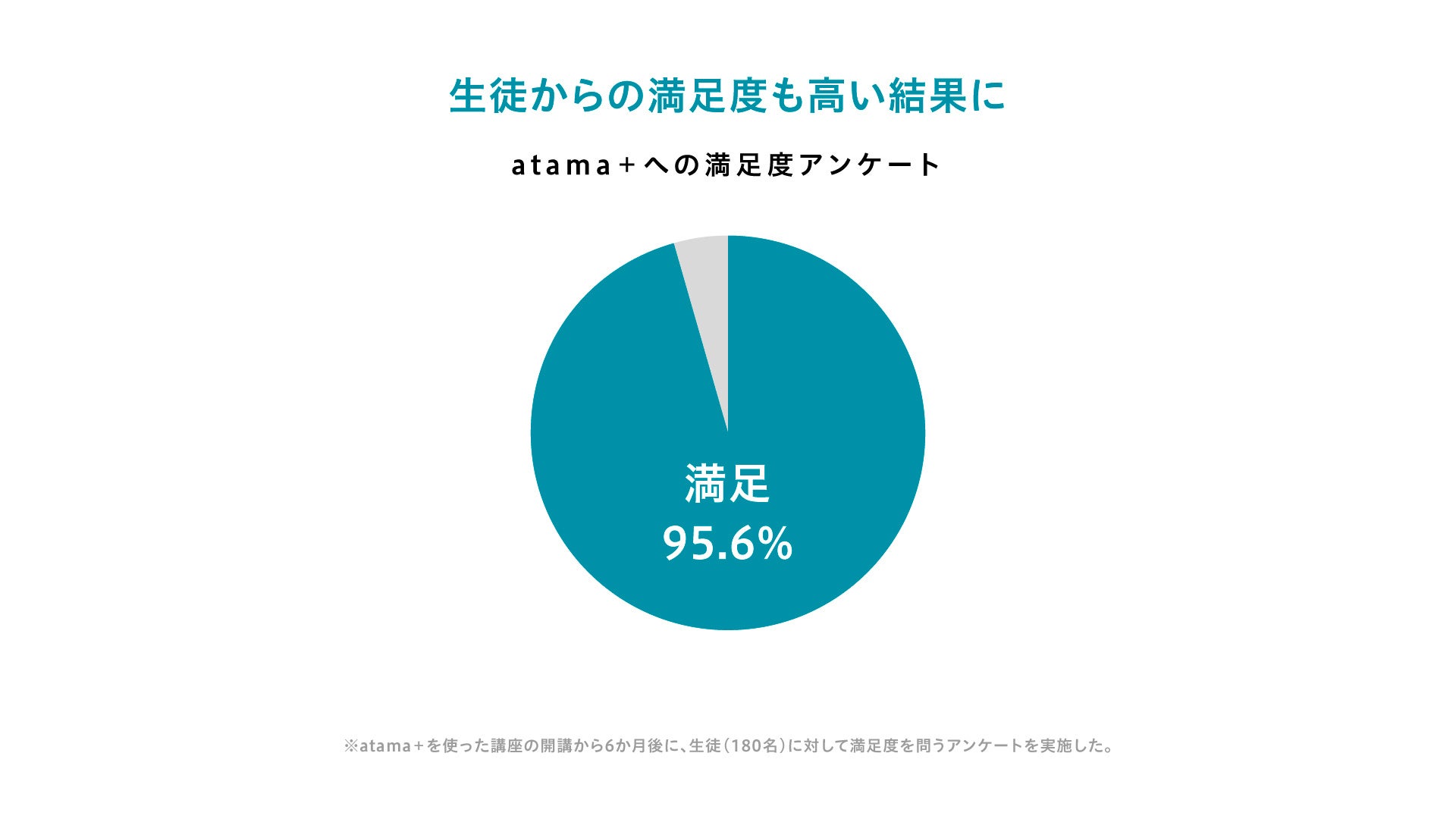 ・生徒180名を対象にした「atama+」利用開始6か月後のアンケートで「atama+」での学習に「とても満足している」もしくは「満足している」と回答した生徒は95.6%となりました。