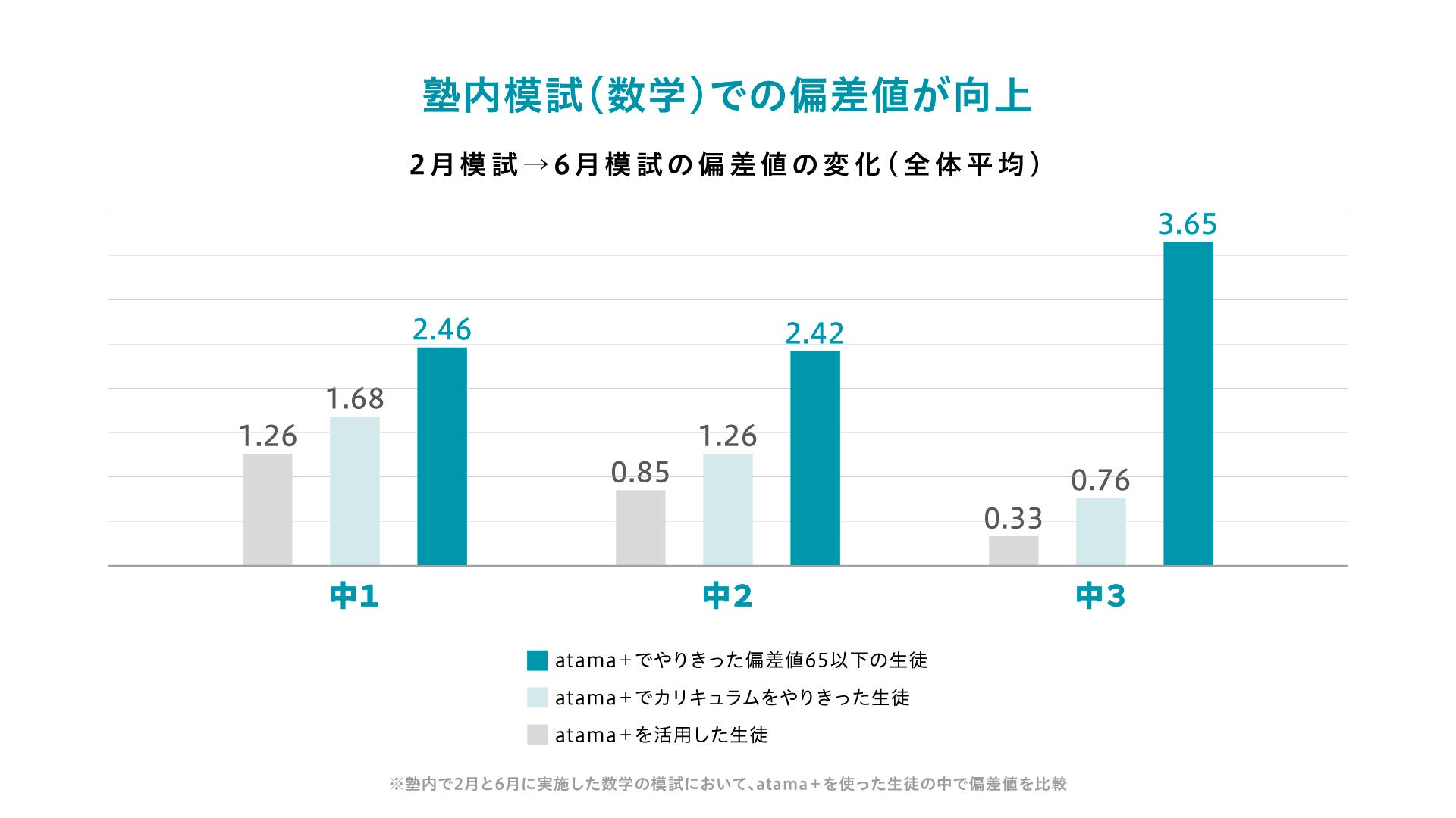 ・2021年2月と6月に行った塾内模試の結果を比較したところ、「atama+」で個別最適化されたカリキュラムを学習した生徒に関して、数学ではすべての学年において偏差値の向上が見られました。