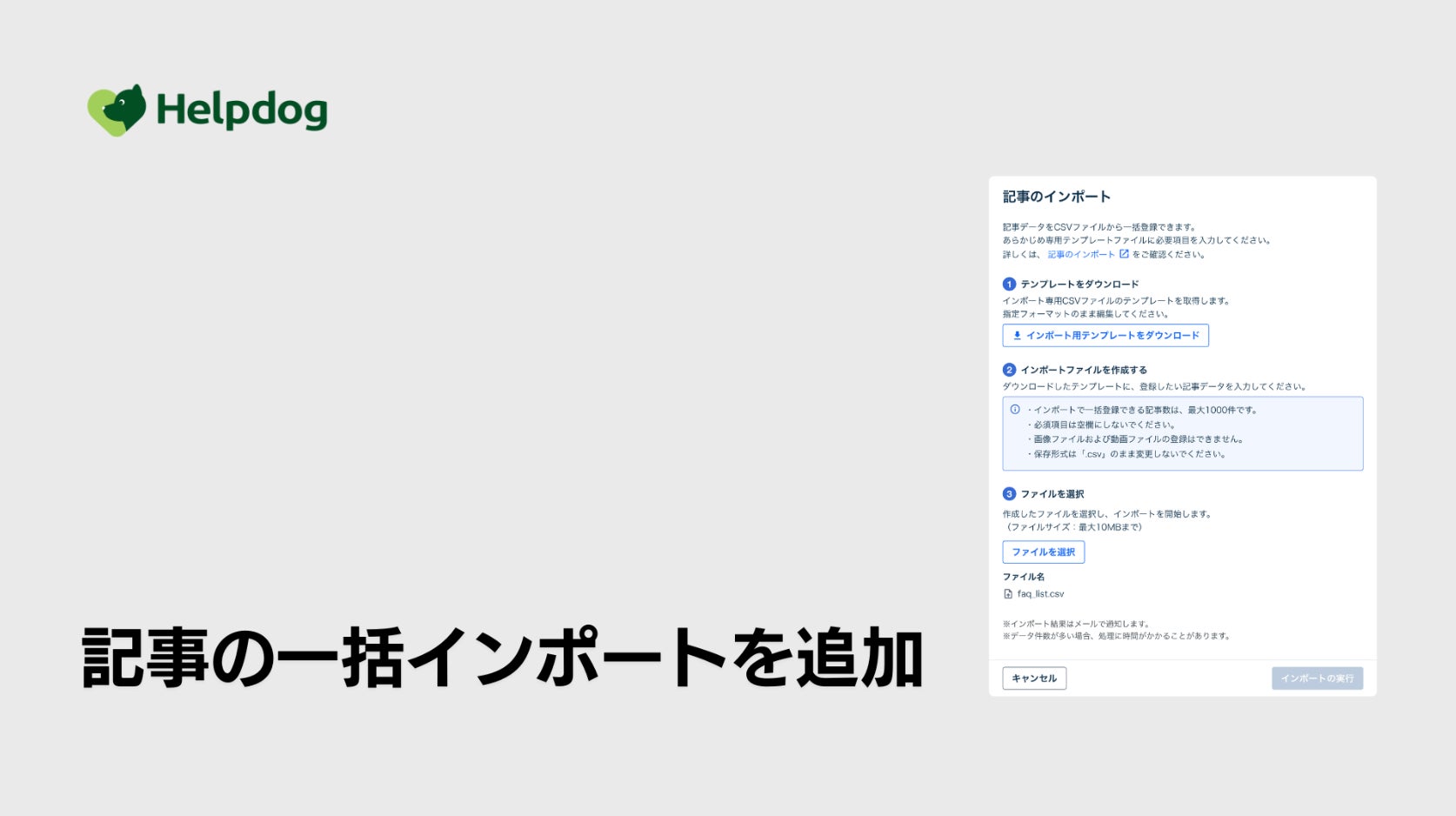 noco株式会社(本社:東京都中央区、代表取締役:堀辺 憲)は、このたび、AIサポートシステム「ヘルプドッグ」(https://helpdog.ai)において、最大1,000件のデータを一度に取り込めるFAQ記事のCSV一括インポート機能の提供を開始しました。