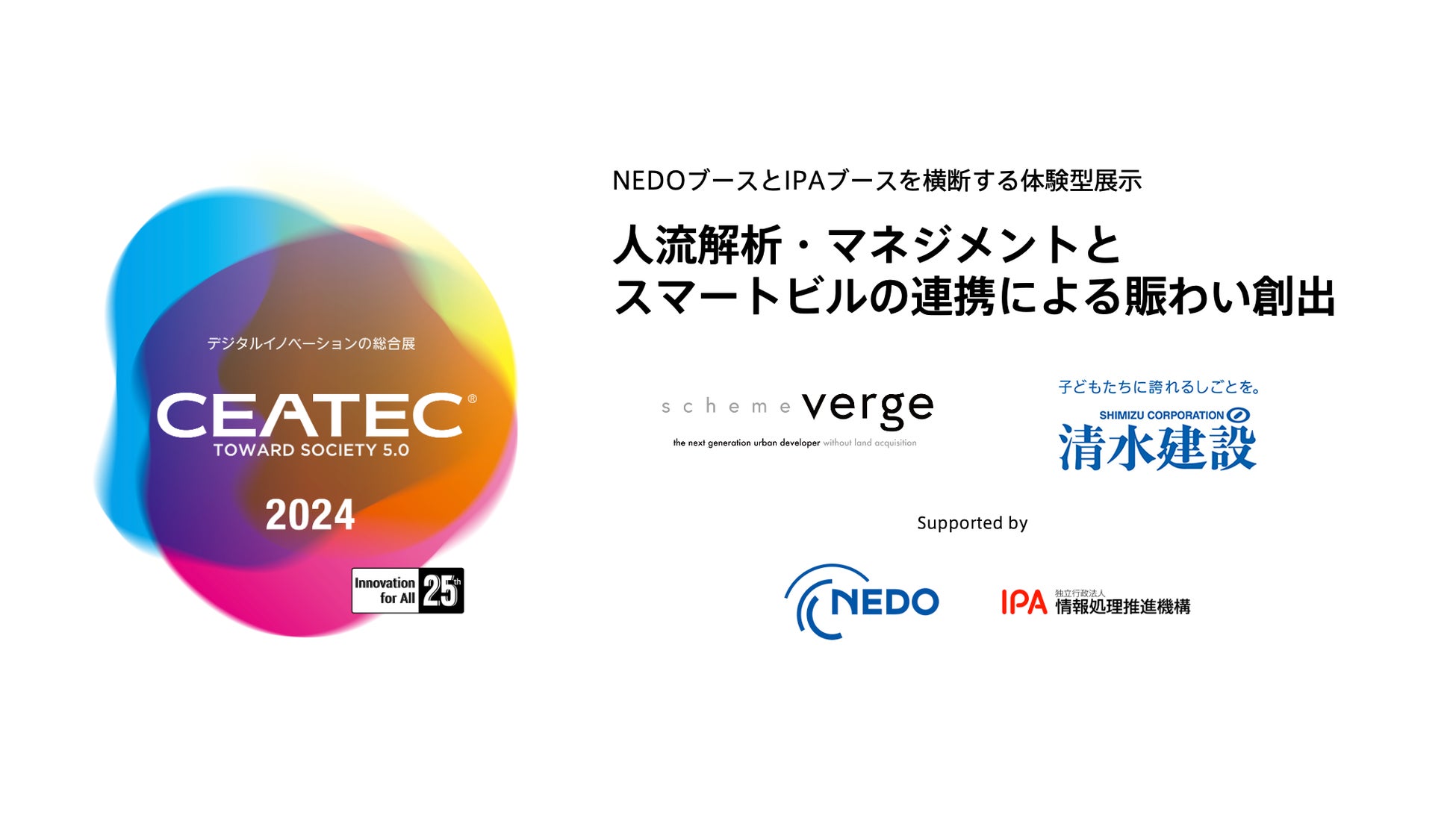 scheme verge株式会社(本社:東京都文京区、代表取締役 嶂南達貴、以下「scheme verge」)は、清水建設株式会社(所在地:東京都中央区、代表取締役社長:井上 和幸、以下「清水建設」)と協力し、2024年10月15日(火)~18日(金)に幕張メッセ(千葉市美浜区)で開催される「CEATEC 2024(シーテック 2024)」に「人流解析・マネジメントとスマートビルの連携による賑わい創出」を展示いたします。
