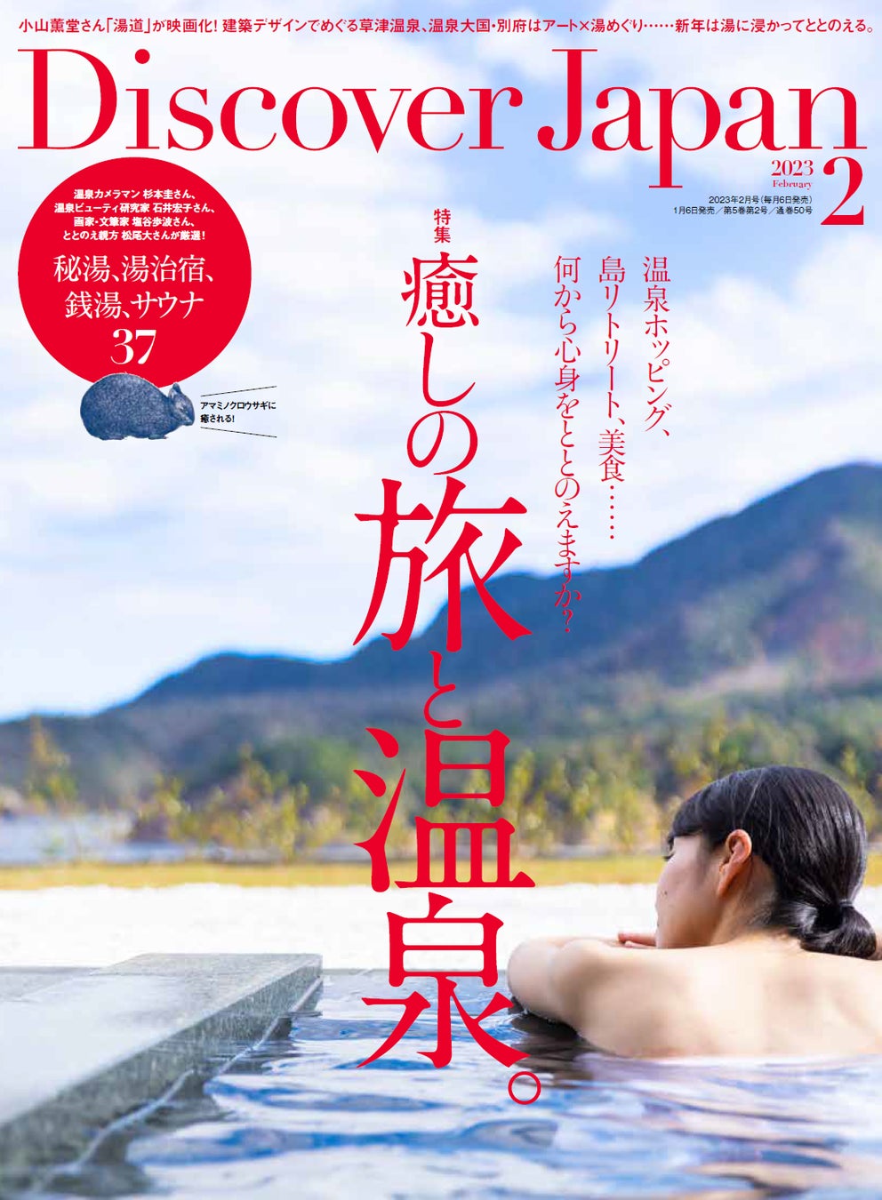 株式会社ディスカバー・ジャパン(所在地:東京都港区、代表取締役社長:髙橋俊宏)が発行する月刊誌『Discover Japan(ディスカバー・ジャパン)』2023年2月号「癒しの旅と温泉。」が発売されました。