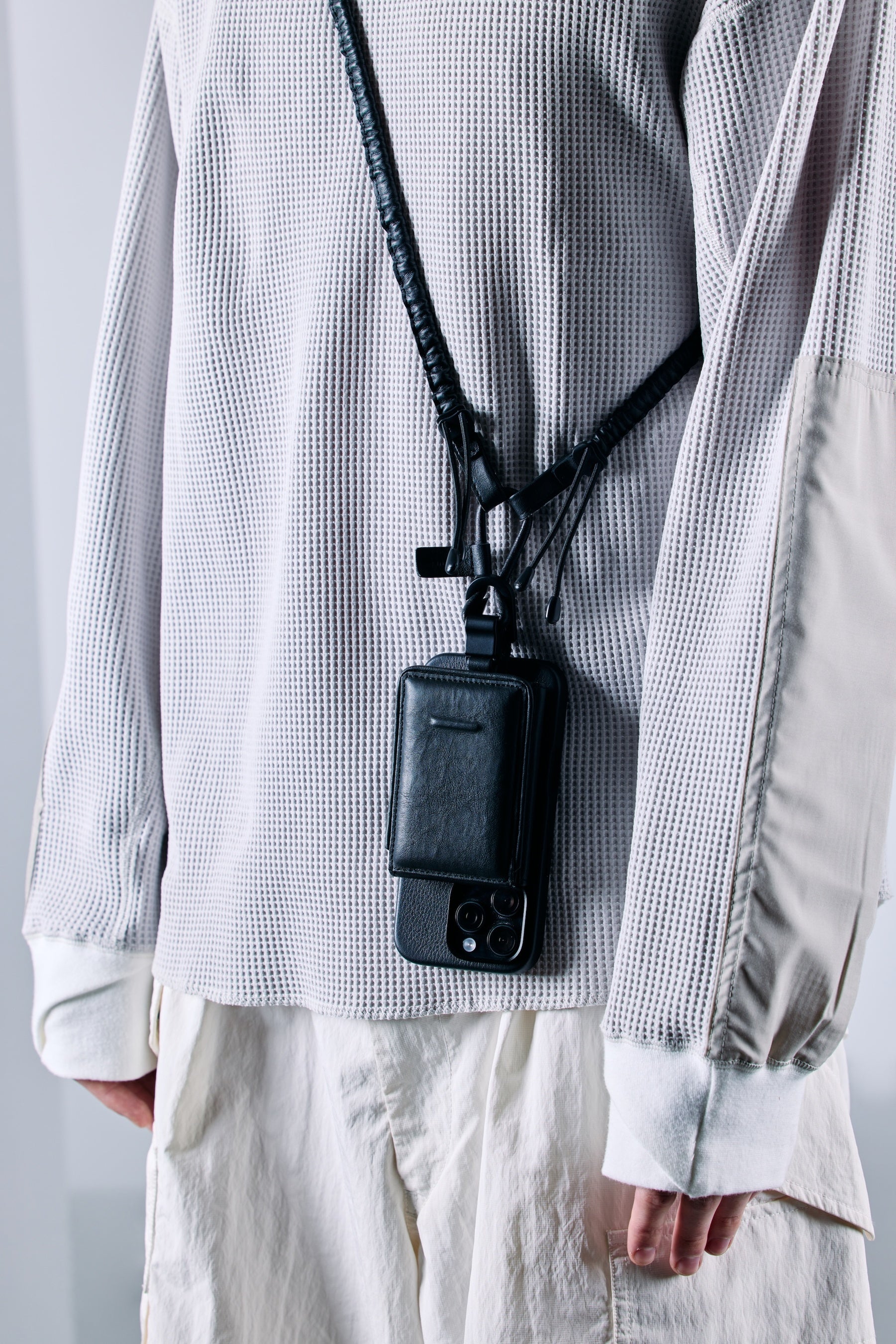 objcts.ioのMagWearシリーズを、meanswhileのデザイナー・藤崎氏が再解釈。アウトドアやミリタリーのシーンでも使用されるバンジーリーシュコードから着想を得たmeanswhileのアーカイブプロダクト”Bungee Leather Neck Strap”のデザインを引用しています。「命綱」・「落下防止具」として発展したバンジーリーシュコードを製品に採用し、スマートフォンと身体を接続するイメージを体現。「持ち運ぶ」を「纏う」という行為へ進化させ、単なる携帯手段を超えたファッション性のあるプロダクトに仕立てました。