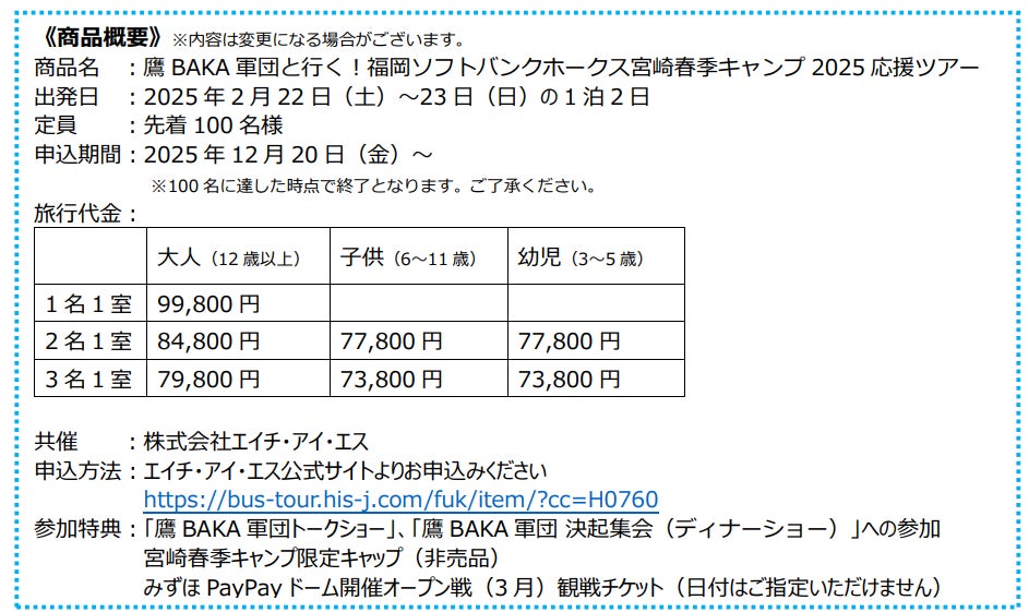 スカパー! は、12 月 20 日(金)17 時より国内旅行「鷹 BAKA 軍団と行く!福岡ソフトバンクホークス 宮崎春季キャンプ 2025 応援ツアー」を発売いたします。 当商品は福岡ソフトバンクホークスの春季キャンプ地が開催 される、生目の杜運動公園(宮崎県宮崎市)を目的地とした 1 泊 2 日のバスツアーです。