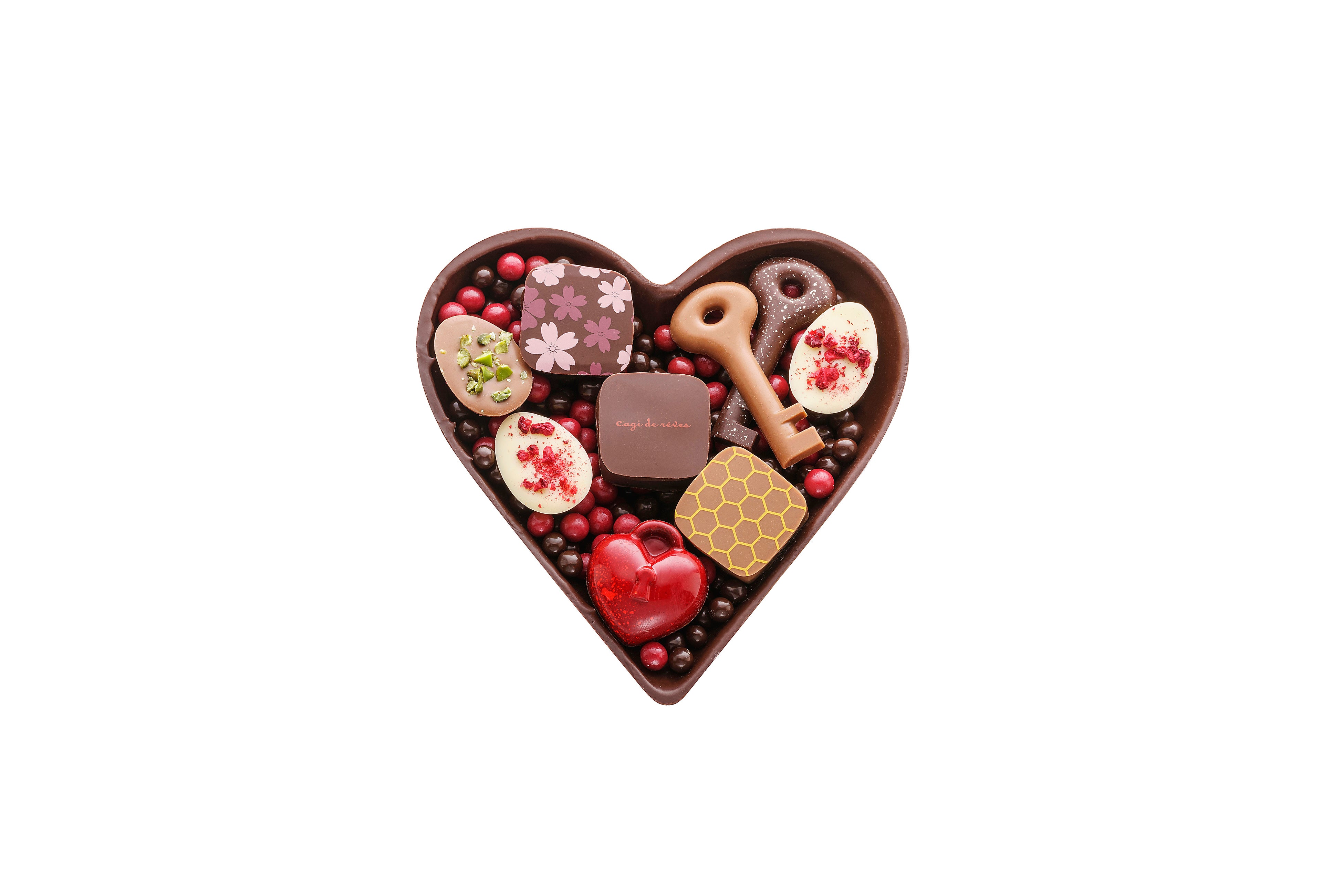 ハートの鍵穴をあしらったパステルカラーの大きなハートの器を開けると、華やかな色合いのショコラがイースタームードを高めます。