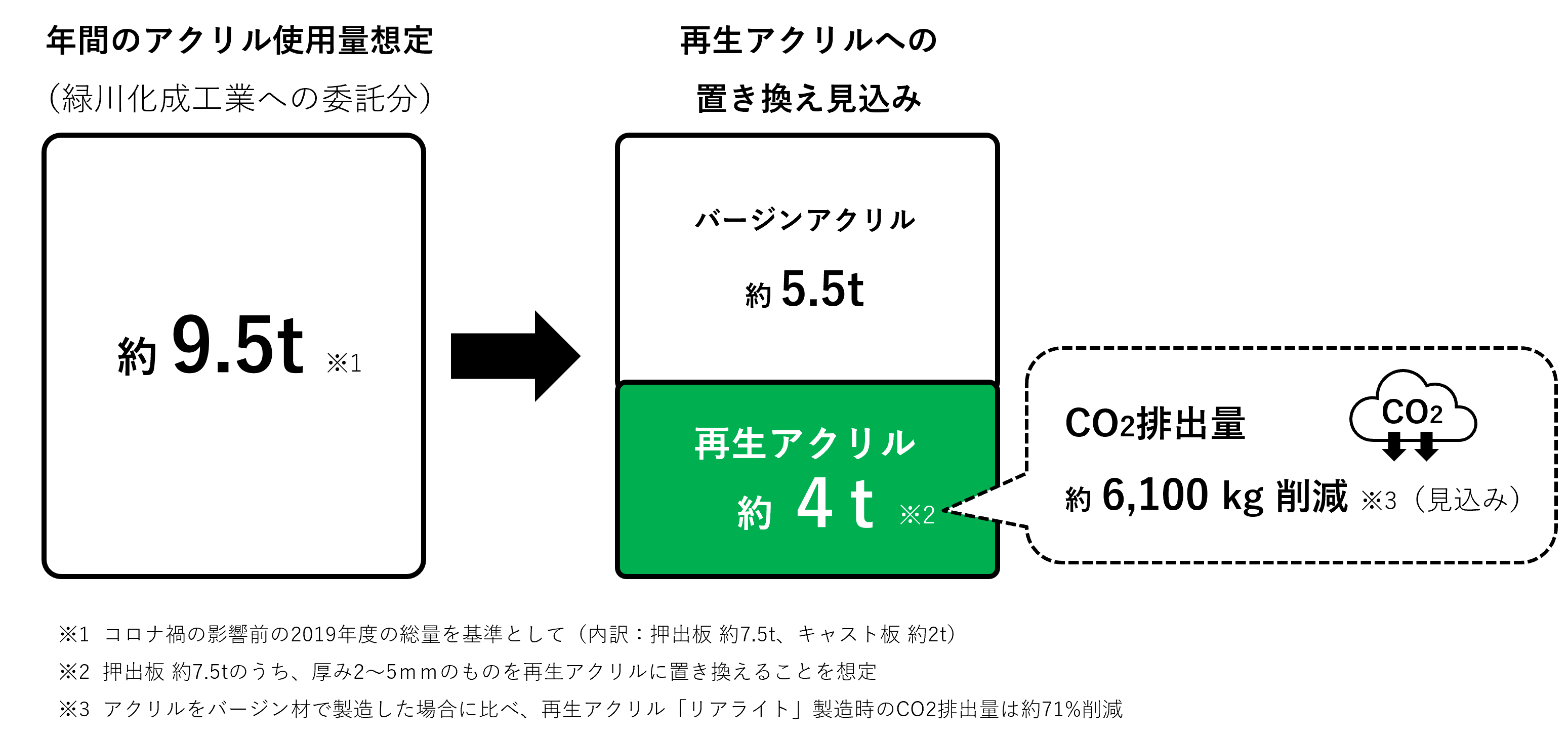 - 緑川化成工業へ委託するアクリルの年間使用量の約42%を再生アクリルに置き換える見込み