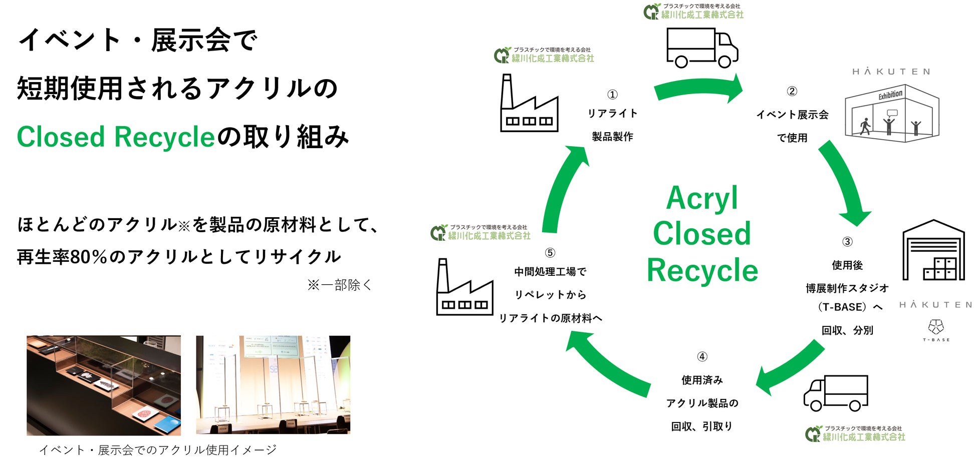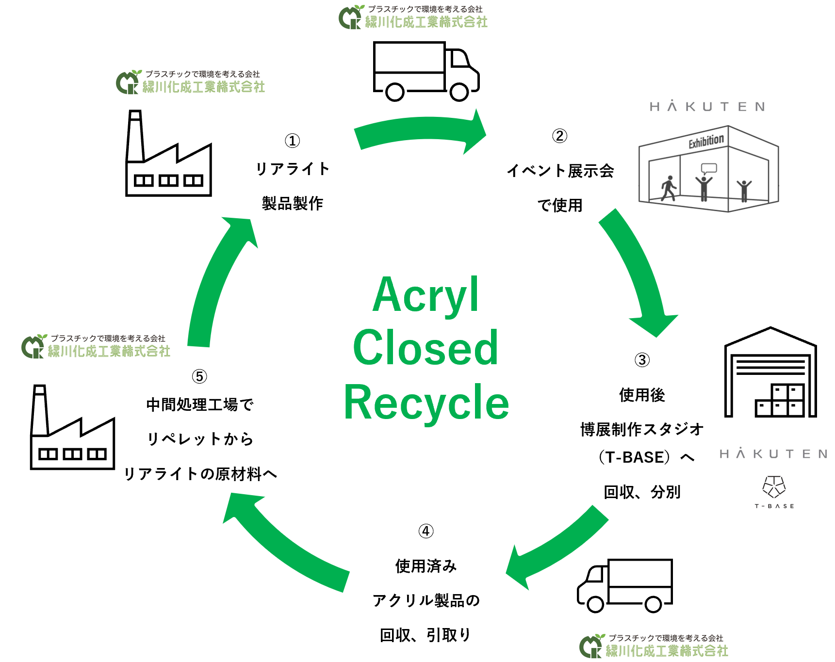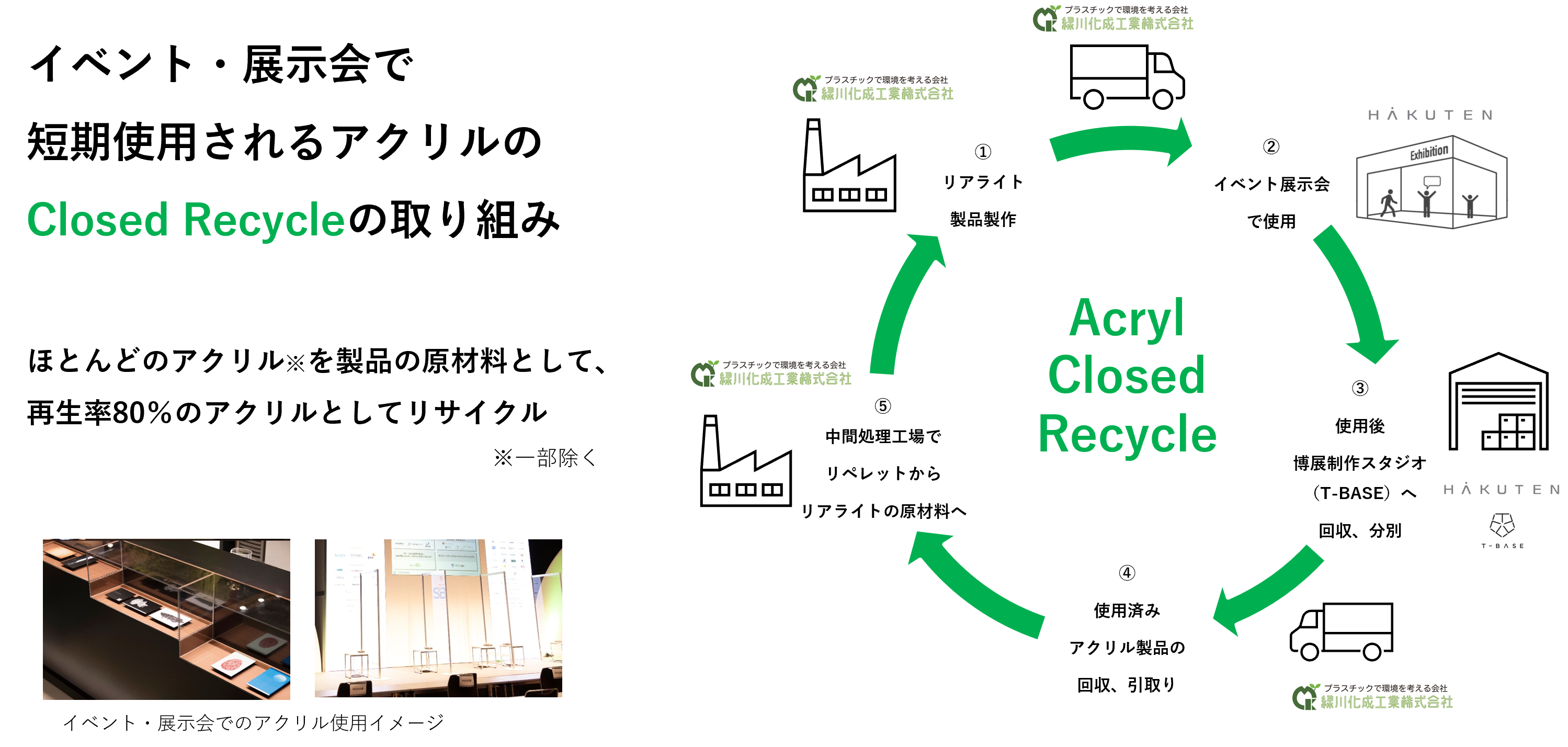 ゼロ・エミッション型のイベントの実現を目指す株式会社 博展(以下「当社」)は、プラスチック総合商社の緑川化成工業株式会社(以下「緑川化成工業」)と、当社が展示会・イベント等で排出するアクリル(一部除く)を再生率80%のアクリルに再生し、再活用をするクローズド・リサイクルの試験運用を開始いたしました。なお、当社はこのようなプロジェクトを推進し、イベント業界における資源の再利用への取り組みを牽引して参ります。