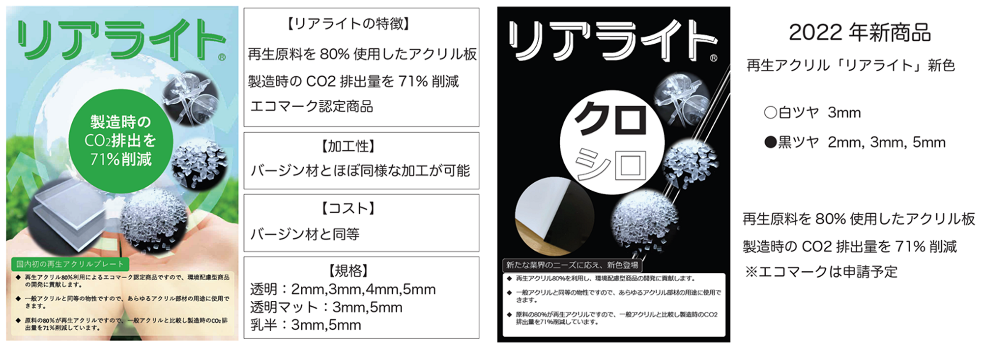 - 再生原料80%の循環型アクリル「リアライト」(緑川化成工業 製造)