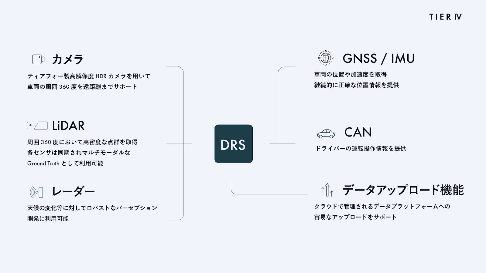 ティアフォーが開発したDRSは、複数の高性能車載LiDAR、高解像度車載カメラや電子制御コンピューターを含み、車両の周囲360度や挙動に関するデータを高精度に記録するためのシステムです。センサー間や電子制御コンピューター間の同期やキャリブレーションを行い、自動運転AI開発に必要な高品質なデータ収集を可能にします。