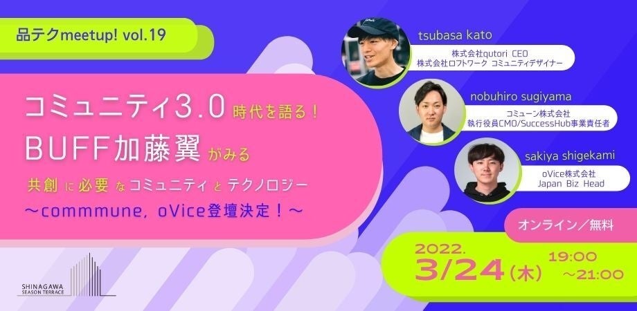 品テクmeetup!は、品川シーズンテラスが主催するテクノロジーをテーマに気になる話題を聞いたり話したり、時には体験もできるテクノロジー交流会イベントです。19回目となる今回は、コロナをきっかけに誰もが意味を問い直すこととなった”コミュニティ”をテーマに、BUFFコミュニティマネージャーの学校を運営するqutori代表取締役 加藤翼が中心となって登壇し、お話しします。