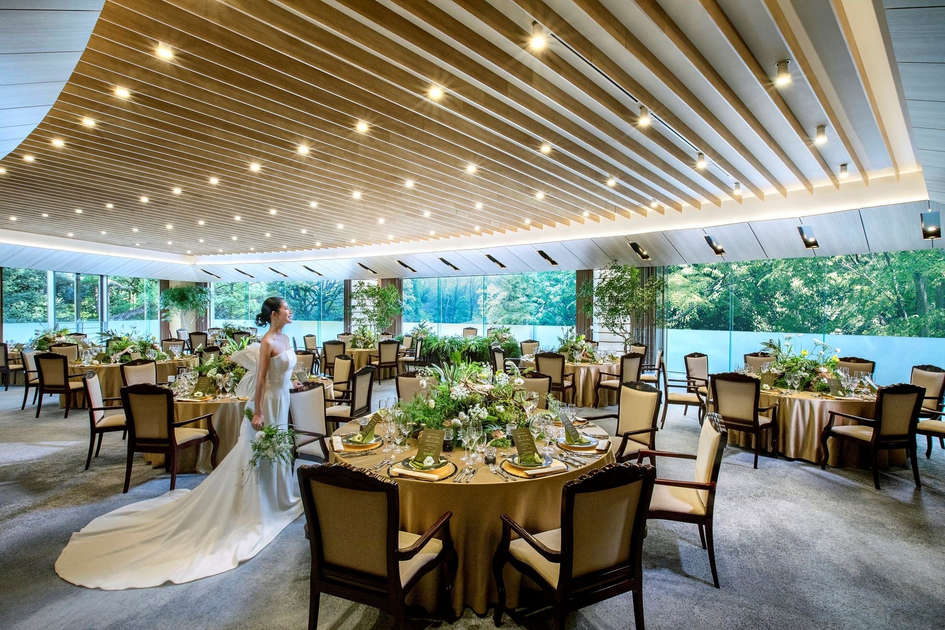 明治神宮の豊かな緑と、テーブルコーディネートが溶け込む「フォレストテラス明治神宮」の披露宴会場。少人数会食から盛大なご披露宴まで、検討人数やスタイルに合わせてご提案いたします。