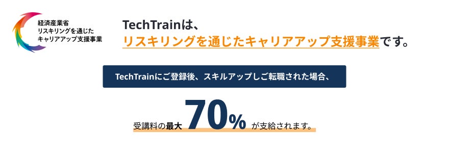 ※ TechTrainは経済産業省「リスキリングを通じたキャリアアップ支援事業」の第1期採択事業に選出いただいています。受講料の最大70%が支給される補助金をご利用いただけます(https://careerup.reskilling.go.jp/)