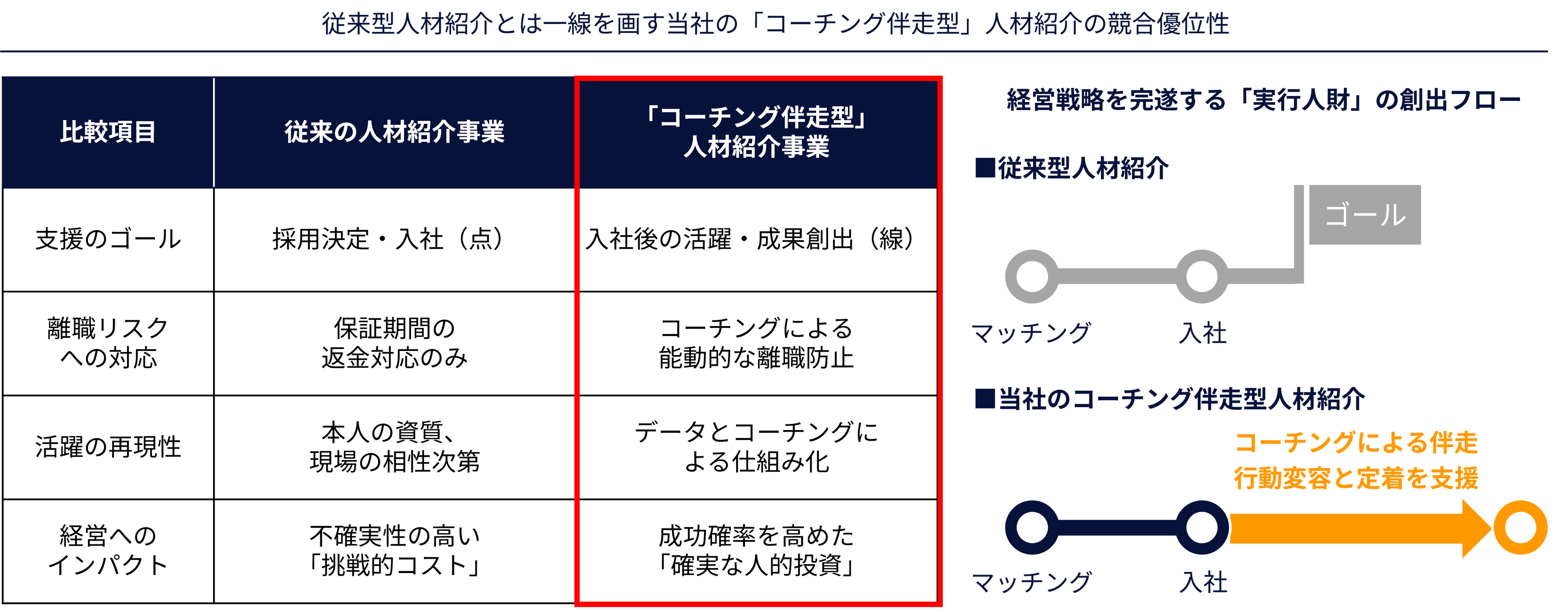 当社はこれまで、ビジネスコーチングを主軸とした人材開発事業を展開してまいりました。今後は本事業の開始により、採用から定着・活躍、成果まで伴走する統合ソリューションで、経営戦略と人事戦略をつなぐ『実行人財』を企業へご提供してまいります。