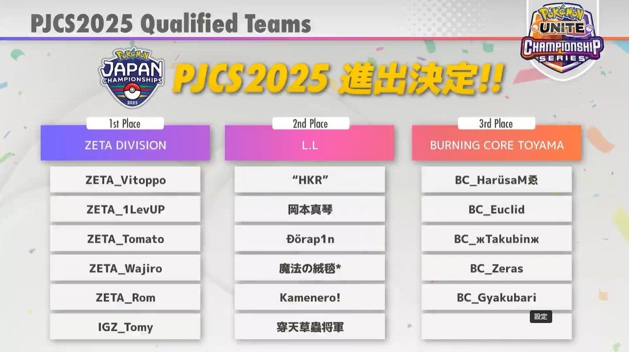 この結果に伴い、「ZETA DIVISION」の『PJCS2025 ポケモンユナイト部門』への出場が決定しました。