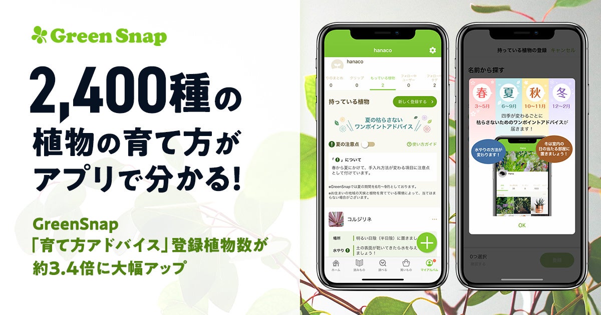 植物コミュニティアプリ「GreenSnap」を運営するGreenSnap株式会社(本社:東京都中央区、代表取締役:西田貴一)は、GreenSnapアプリの「育て方アドバイス」機能において、登録できる植物の数が約700種から約2,400種へと約3.4倍に大幅にアップしました。植物の個別の育て方をアプリでお知らせするのは国内でGreenSnapアプリだけです。
