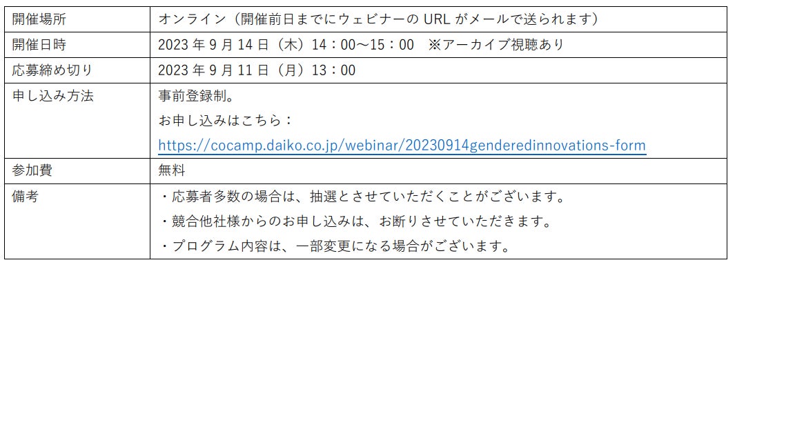 【お申し込みはこちら(無料/登録制): https://cocamp.daiko.co.jp/webinar/20230914-genderedinnovations-form 】