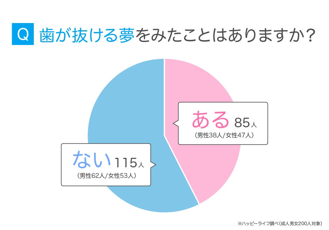 今回の記事では、累計会員数3500万(※1)を誇る出会い・恋愛マッチングアプリ・サービス「ハッピーメール( https://happymail.co.jp/ )(運営:株式会社アイベック 本社:福岡県福岡市)」にて、成人男女200人を対象に、「歯が抜ける夢」に関するアンケート調査を実施しました。