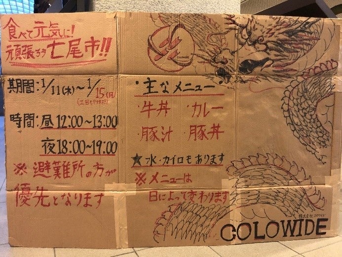 まず、石川県志賀町の避難所として指定されている「町立志賀小学校」におきましては、昨日までの2日間にわたり、昼450食、夜650食、1日1,100食、合計2,200食の提供を行い、同所に避難されている約100名の方をはじめ地域住民の方々に至るまで幅広くご利用いただきました。