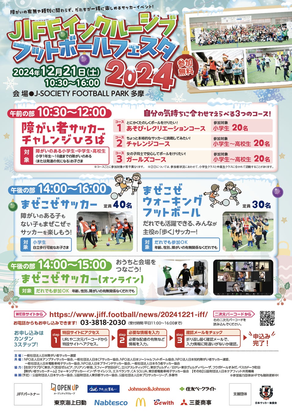 ⼀般社団法⼈⽇本障がい者サッカー連盟(JIFF/会⻑:北澤豪)は、2024年12⽉21⽇(⼟)にJ-SOCIETY FOOTBALL PARK 多摩(東京都多摩市)およびオンラインで「JIFFインクルーシブフットボールフェスタ2024」を開催します。本イベントは、”障がいの有無に関わらず混ざり合える共生社会の実現に向け、サッカーを通じて障がい児・者と健常児・者の相互理解の機会をつくる”理念に則り、JIFFが設⽴された初年度(2016年)から毎年12⽉に開催、今回で9回目となります。昨年度初めて実施をした、障がいのある子どもと障がい者サッカーとの出会いの機会を創出するための「障がい者サッカーチャレンジひろば」では、今年新たにガールズコースを設置し、女の子でも参加がしやすいイベントづくりを目指します。