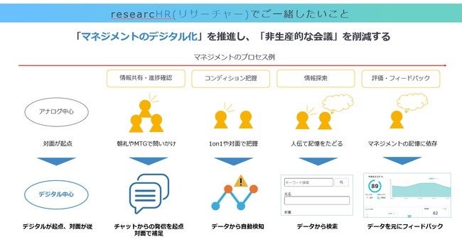 「マネージャー主導による会議や1on1での対面コミュニケーションが中心。会議も進捗確認が中心になりがちで、カレンダーが会議ばかりで埋まっている」、「1on1で対話して確認するまでメンバーの状況が分からない」、「期末評価や担当者探しの際には、マネージャーの記憶に頼るしか無いが、リモートでそれも失われつつある」といった、メンバー・マネージャー双方の働き方に関する課題の解決を目指します。