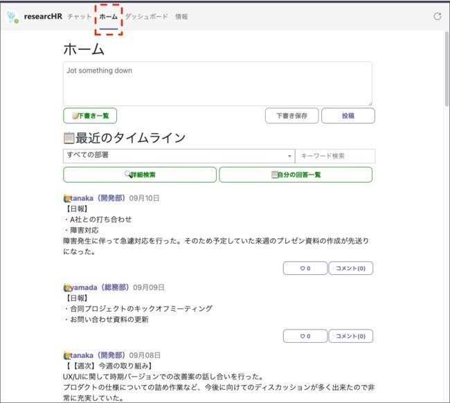 今回、両社はリコー社内の本番データを用いた実証を経て得た結果を元に、メンバーのコンディション状況を正確に把握するための「独自のスコア(*)」を開発しました。researcHRを通じて発信した文章・回答を収集・分析し、発信量や頻度、内容を数値化することでメンバーのコンディションを可視化します。