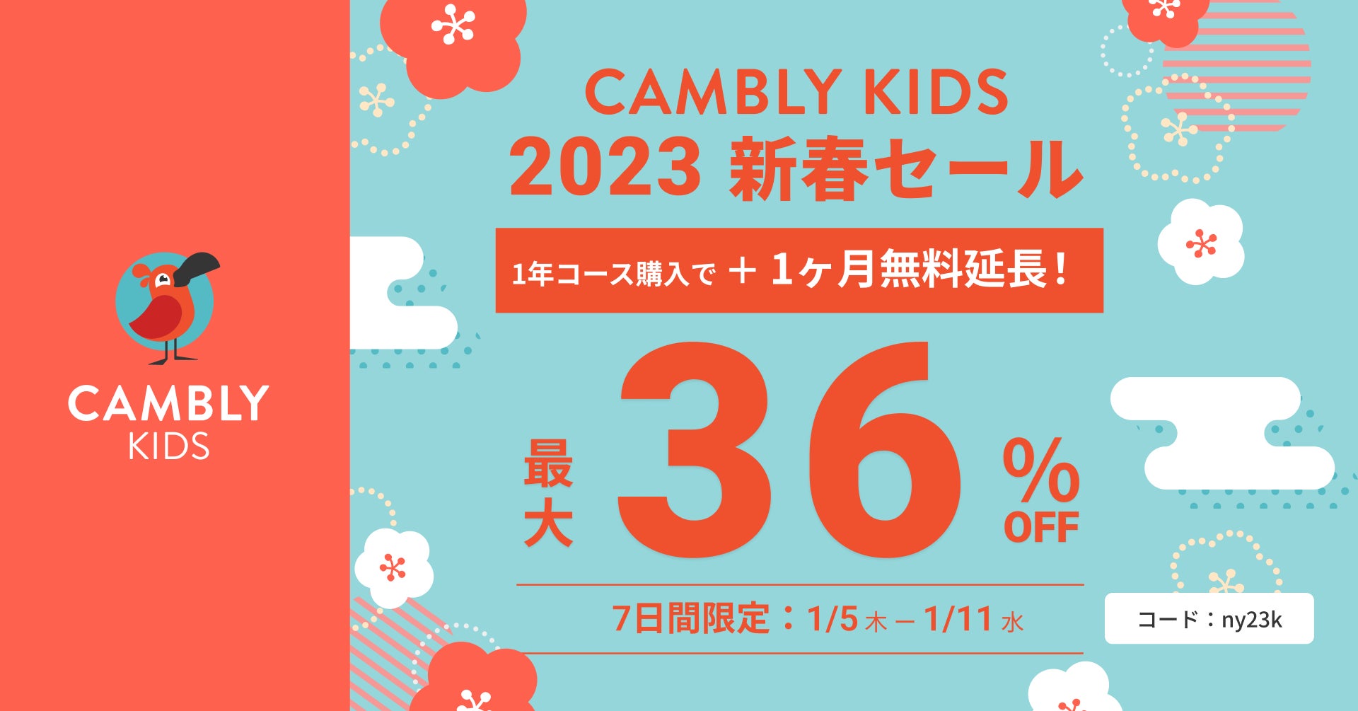 そんなCambly Kidsの英会話レッスンが最大36%オフでご利用いただける新春セールを、1月5日(木)から1月11日(水)までの7日間開催!さらに今なら、1年コースに登録するとご利用期間を1ヶ月無料で延長する特典つきです。