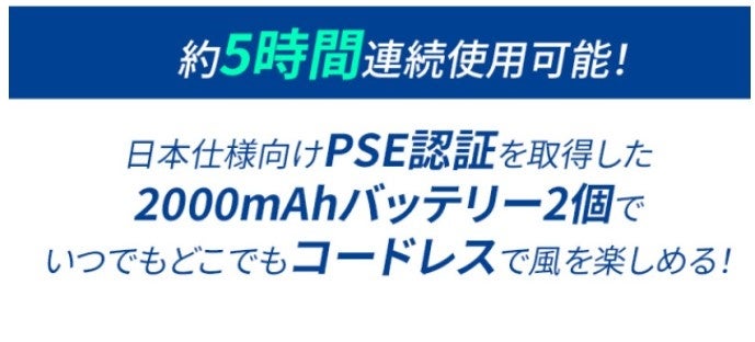4000mAhのバッテリーで最大約5時間の使用が可能です。強風モードの場合、約1時間30分の使用となります。