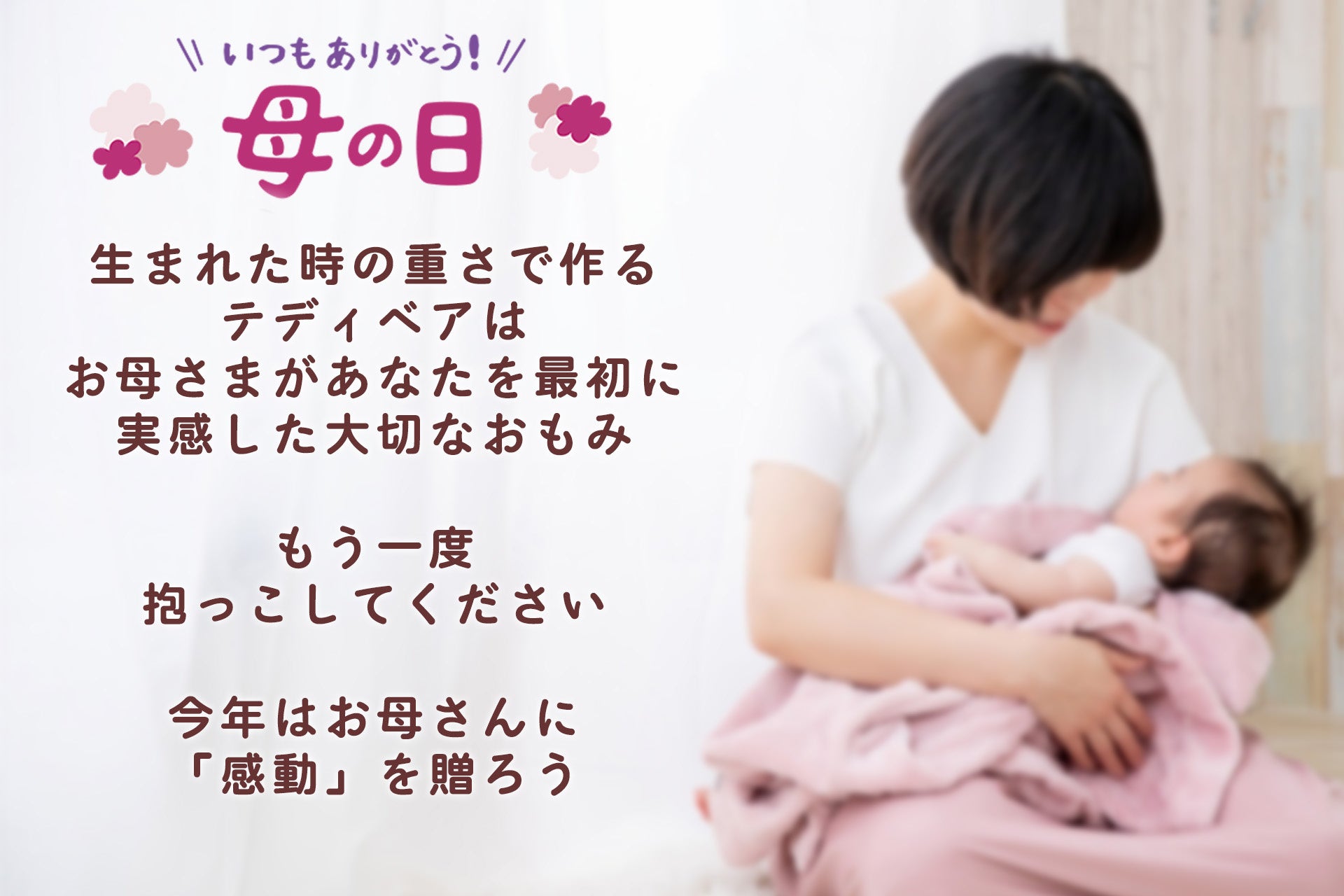 感動を重ねる母の日に。「おかあさん いつも ありがとう」生まれた時の重さで作るテディベア。その重みに「感謝」の想いを込めて。「体重ベア/ウエイトベア」でいつもと違う母の日を演出します。