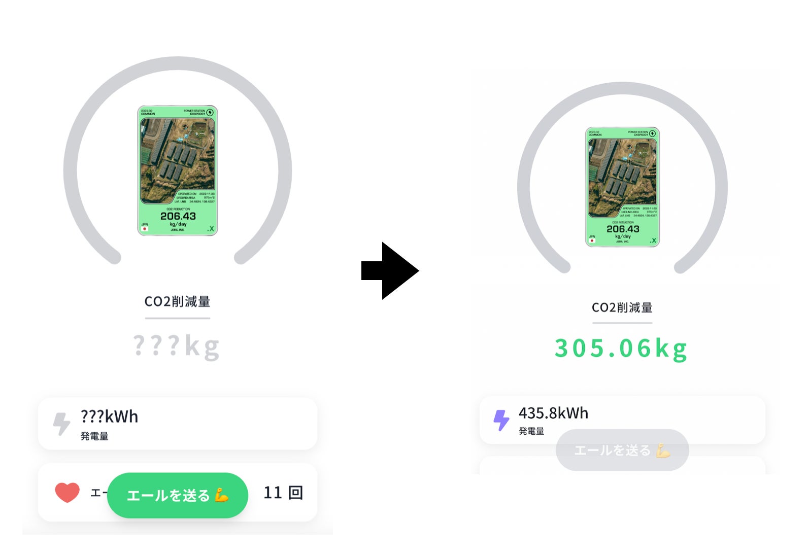 デジタルオーナーは、対象施設の画面で「エール」(応援)を送ると、日々のCO2削減データをリアルタイムで確認できるとともに、「エールポイント」を獲得できます。エールは1つのNFTに対して、1日1回だけ送ることができます。デジタルオーナーたちの応援熱量によってはボーナスポイントを獲得することキャンペーンを時々に展開しています。