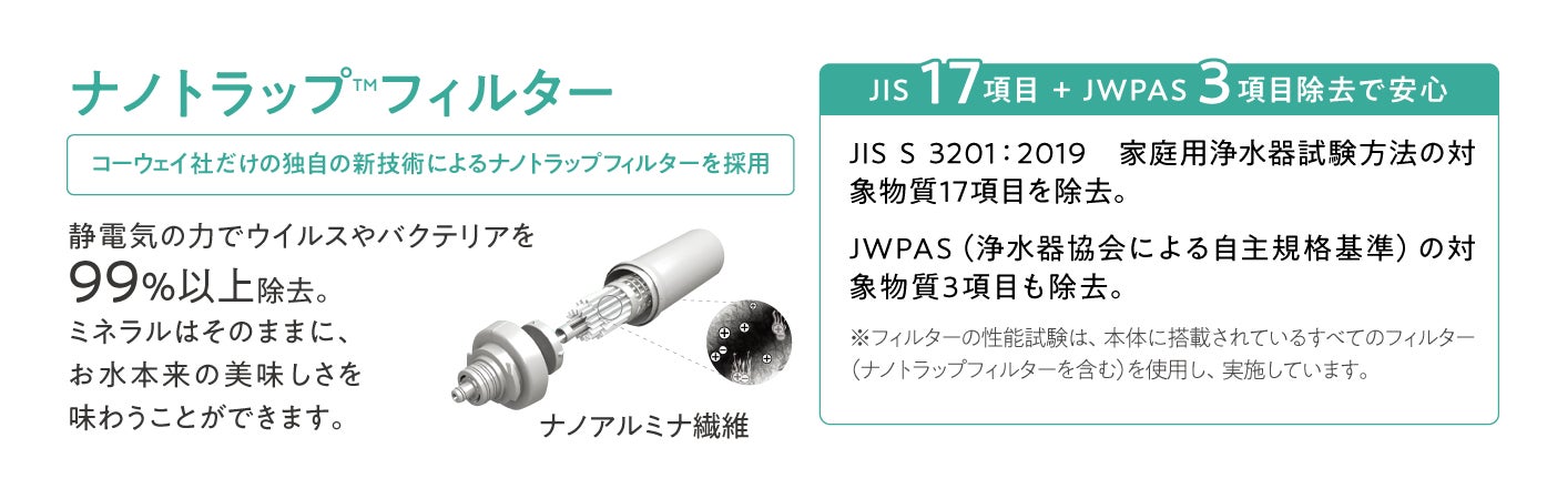 『アイコン』は、高性能ナノトラップフィルターを通してミネラルはそのままに、JIS(日本産業規格)で定める対象物質17項目を除去可能な高い浄水能力を有するほか、瞬間給湯機能・ペルチェ式電子冷却システムにより省エネ設計である点が特長です。