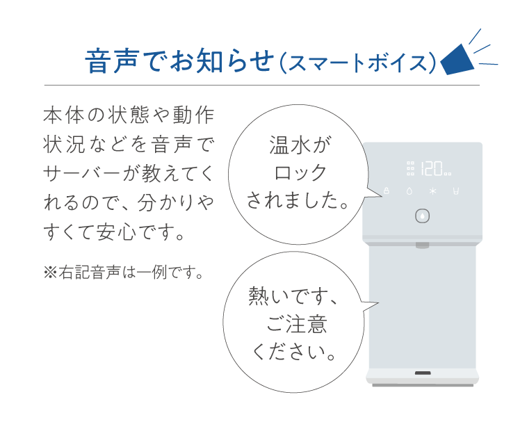 また、水道直結ウォーターサーバー「ウォータースタンド」では初めてとなる音声ガイダンス機能が搭載されました。音声ガイダンスに従って、お客様ご自身で簡単にフィルター交換でき、ウォーターサーバーを使用する際の手間を極力省くことができます。