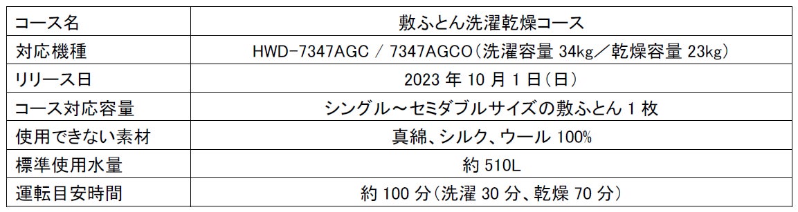 本コースは2022年4月に発売した超大型洗濯乾燥機(HWD-7347AGC/7347AGCO)に設定できる専用コースです。従来は、敷ふとん洗い専用コースで洗濯したのち、敷ふとん専用乾燥機で乾燥させる、といった機器の使い分けや移し替えが必要でしたが、本コースを設定することにより超大型洗濯乾燥機1台で、約100分で敷ふとんの洗濯から乾燥までを一気に済ますことができるようになりました。また、敷ふとん専用乾燥機を導入されていない店舗でも、超大型洗濯乾燥機が設置されていれば、本コースを設定するだけで、一般衣類のまとめ洗いから、羽毛ふとん、敷ふとんの洗濯乾燥まで、1台で幅広い洗濯ニーズに対応できるようになり、効率よく機器を稼働させることができます。