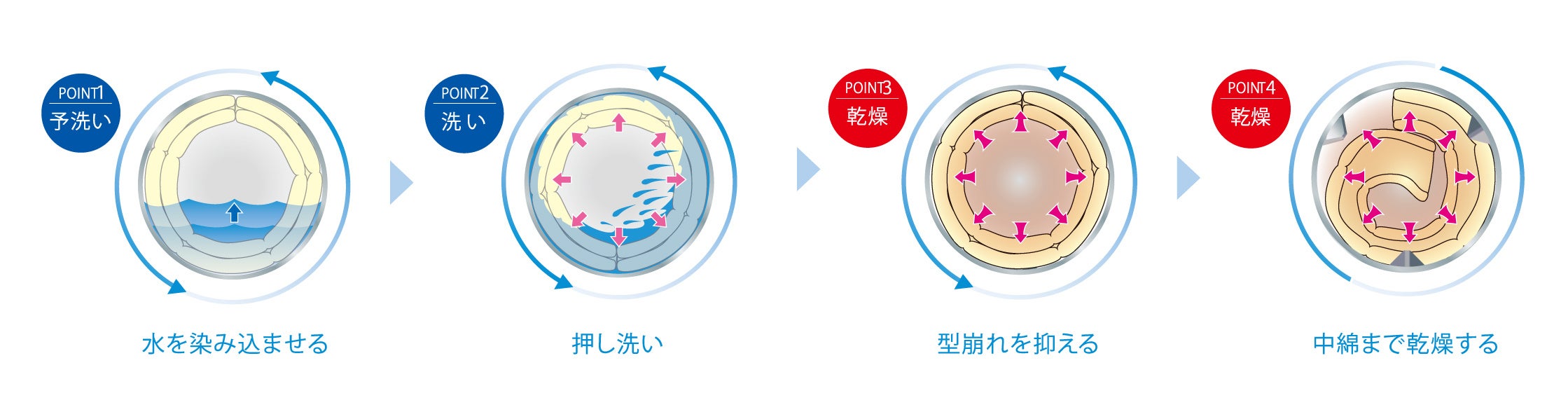 洗いの工程ではドラムを一方向に回転させ、ふとんの型崩れを抑えます。さらにドラムを高い回転数で回すことで洗剤液がふとんを通過する押し洗い効果によって敷ふとんをきれいに洗浄します。