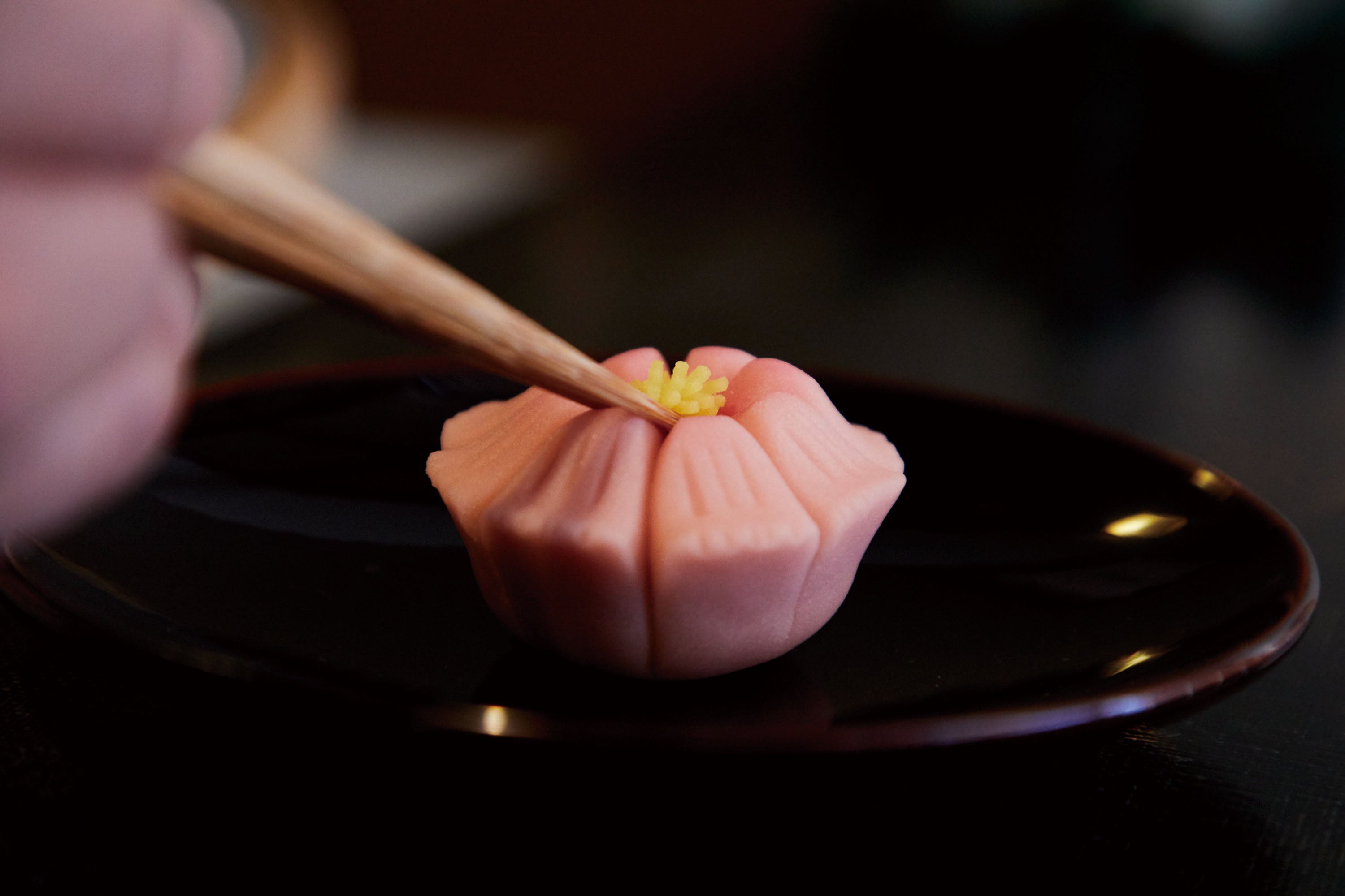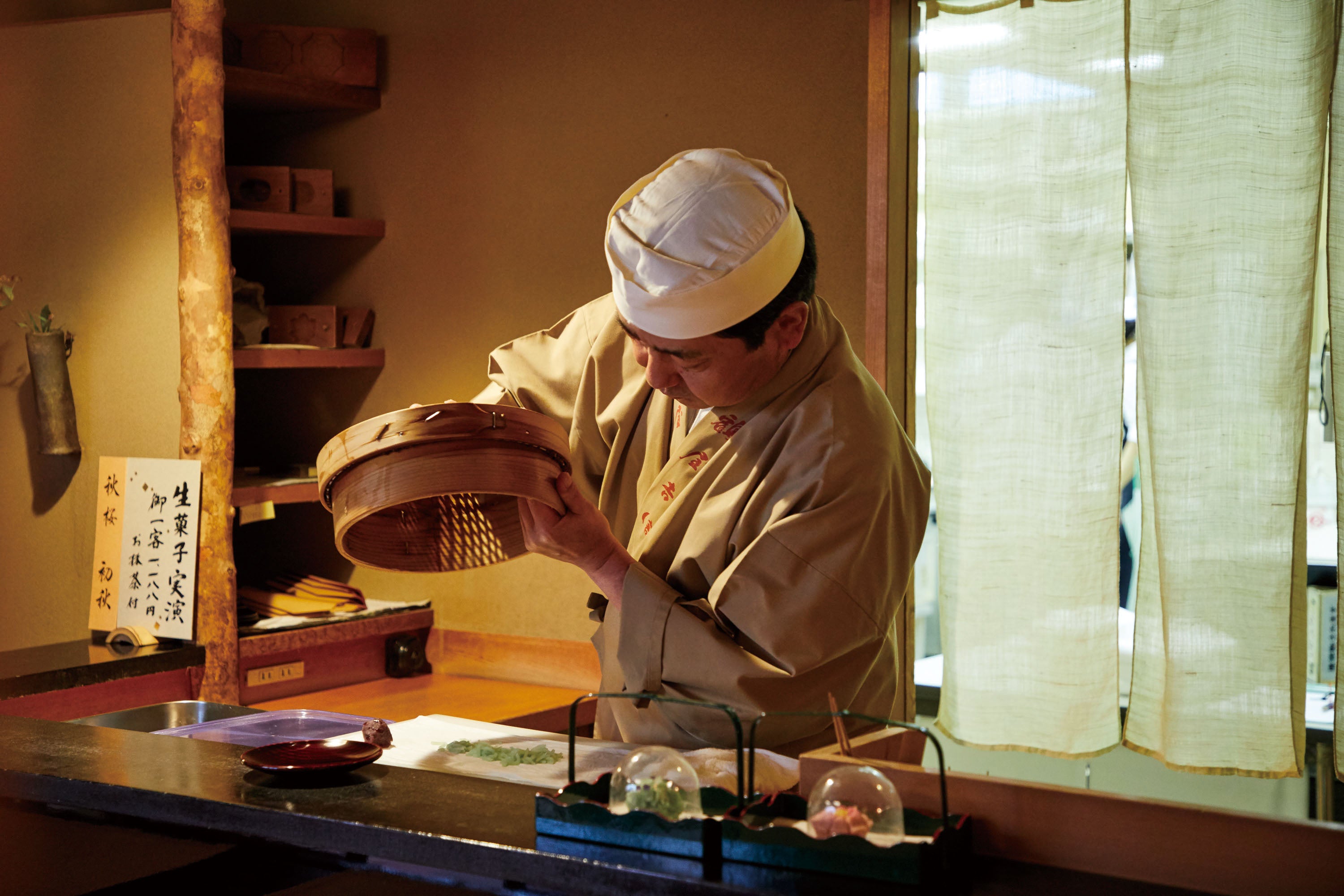 その一角「菓遊茶屋(かゆうぢゃや)」は、まるでお寿司屋さんのようなカウンター形式のお席で、経験豊富な京菓子職人がお客様の目の前で、生菓子(上生菓子)をおつくりする実演の場。みるみるうちにできあがる季節の生菓子は新鮮で美しく、点てたてのお抹茶とともにお召し上がりいただくと格別のご体験と思い出になることと存じます。