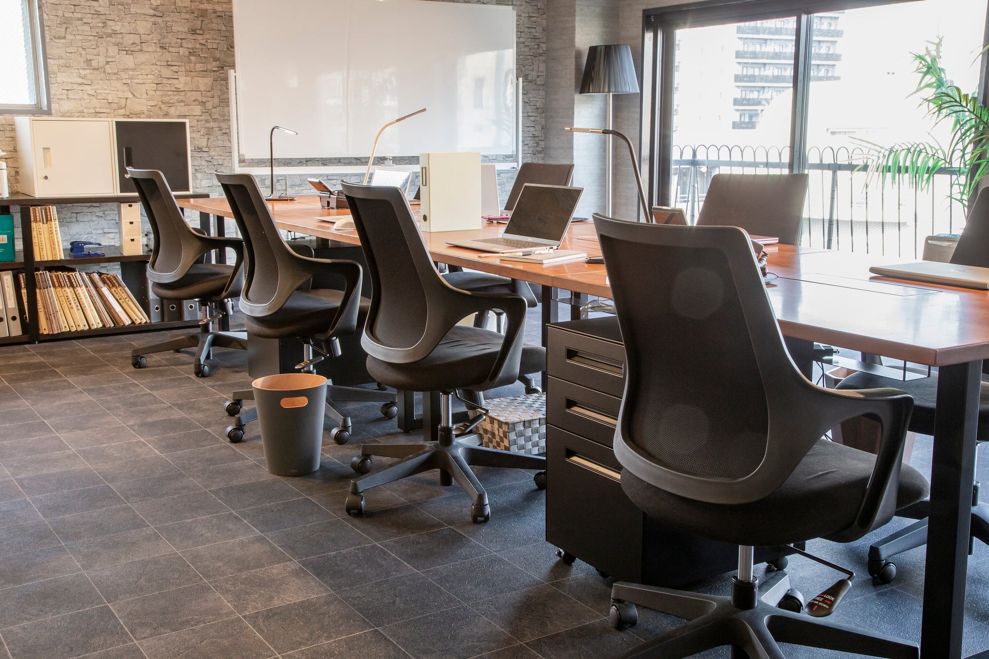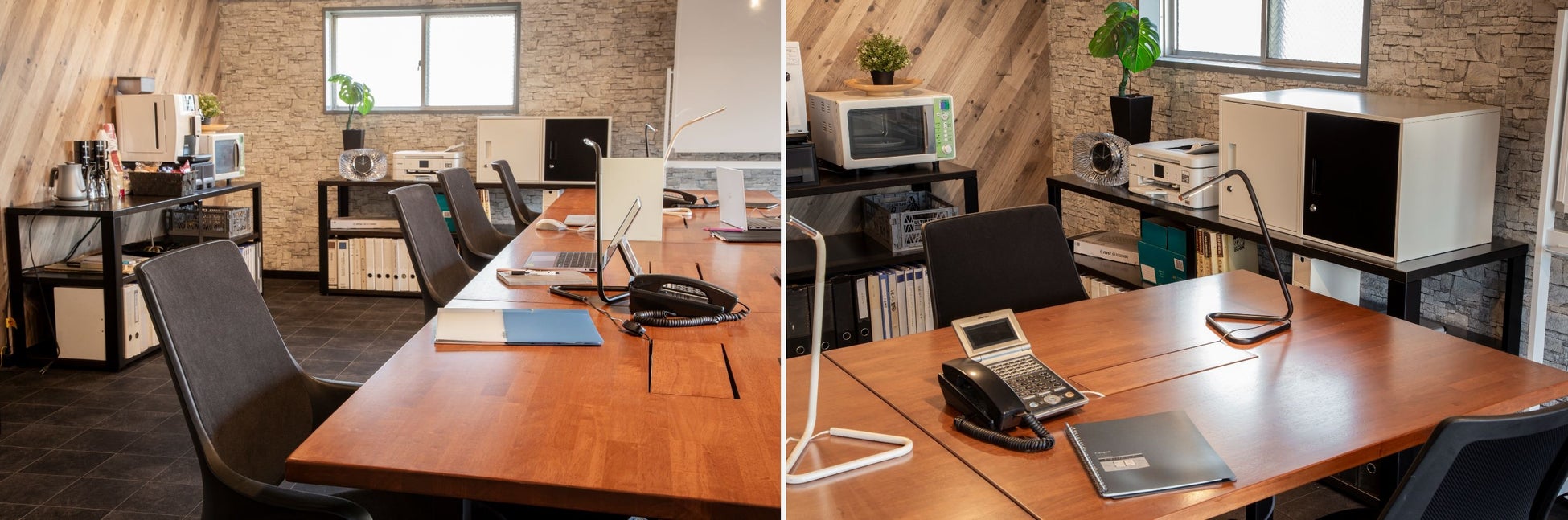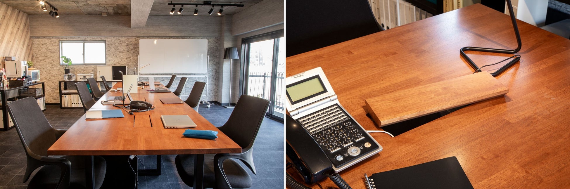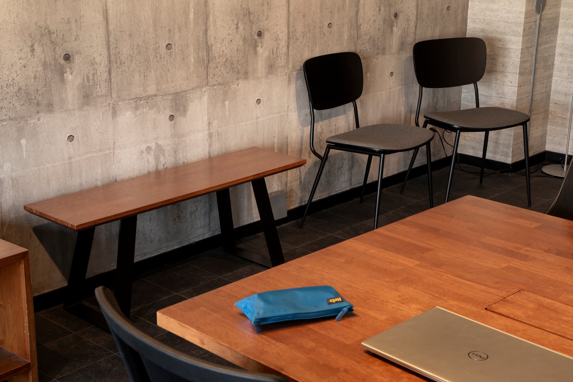 モノトーンを中心としたモルタル調の空間で、当社が強みとする「5000通りを超える天板と脚の組み合わせ」を活用し、ラバーウッド ブラウンを天板に使用したデスクやベンチを設置。落ち着いたブリックカラーがモノトーンの空間に表情を与えています。