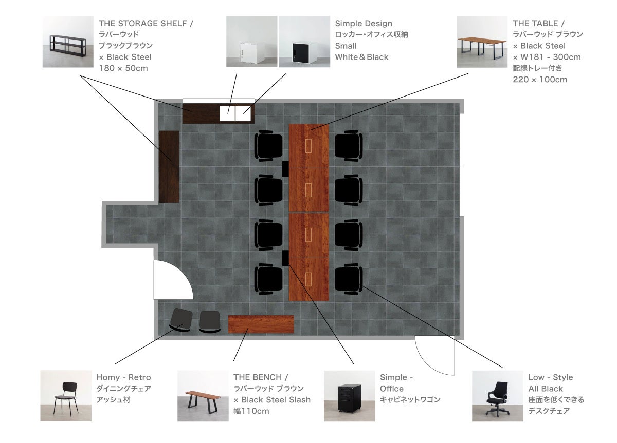 中央のデスクは幅220cmの大型デスクを2台繋げることで幅440cmの長さとなり、メンバーが集まって仕事をする場所となっています。また、全てのアイテムの脚部はブラックアイアンで統一し、チェアやキャビネット等も黒を取り入れてダークなトーンを作り上げています。