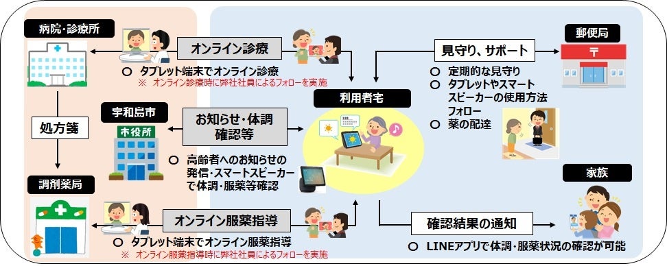 スマートスピーカーを活用した見守りアプリケーション(高齢者の生活状況の確認、確認結果の家族などへの通知、家族や宇和島市などから高齢者へのお知らせの発信)を提供するほか、郵便局社員によるスマートスピーカーの使用方法やタブレット端末を活用したオンライン診療・オンライン服薬指導実施に関するフォロー、医薬品の配達などを行います。