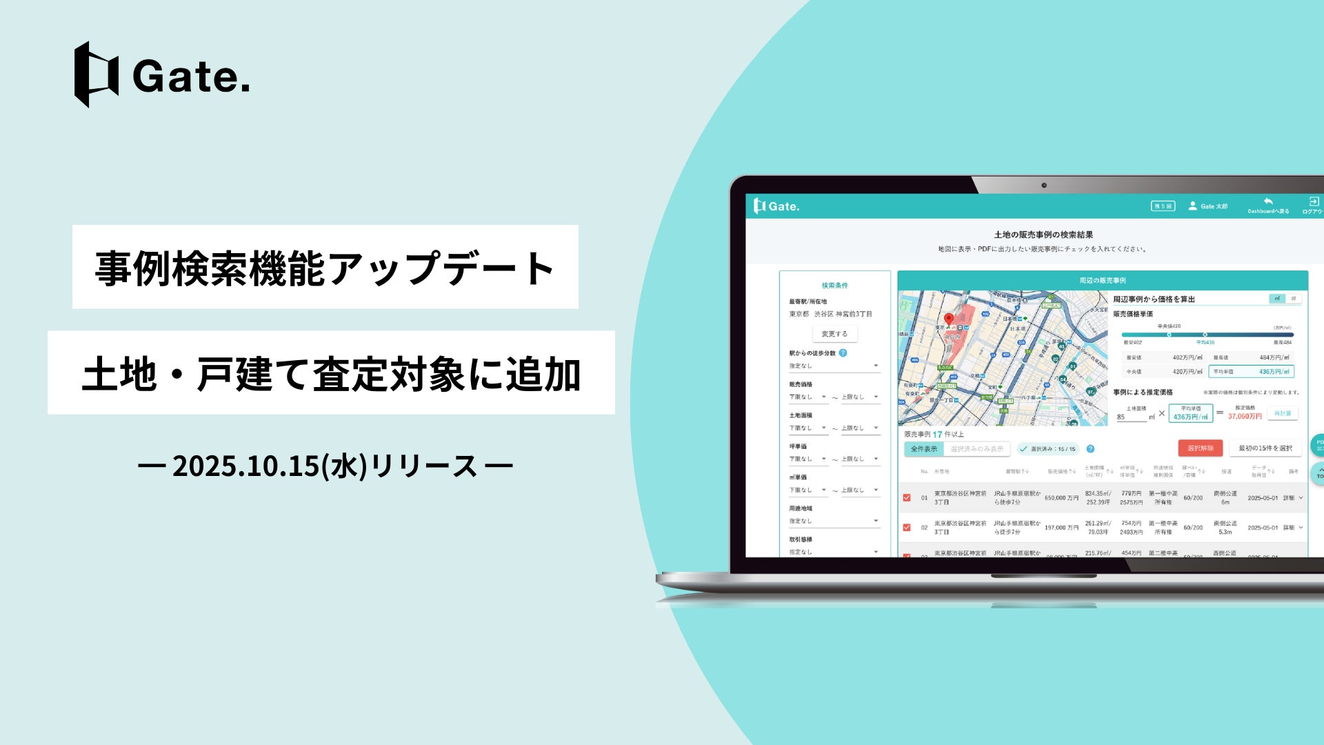 リーウェイズ株式会社(本社:東京都渋谷区、代表取締役:巻口 成憲)は、不動産AIクラウド分析サービス「Gate.」の事例検索機能を大幅にアップデートいたしました。これにより、従来対象外だった土地・戸建てについても周辺事例から簡易に査定できるようになり、営業・投資判断だけでなく、相続税評価など税務・会計の現場でも活用可能な機能へと進化しました。
