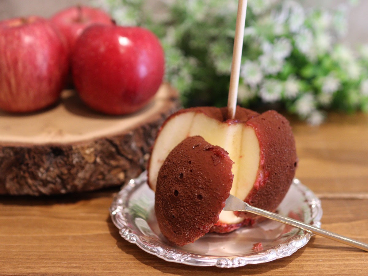 りんごの食感と、飴の食感に一体感が生まれるようにパリパリに仕上げ、ジューシーなりんごの果汁で、飴は口の中で一瞬で溶け混ざり合うよう薄くコーティングしています。そのため甘みの中に感じるりんご本来の酸味と甘い香りが口いっぱいに広がります。