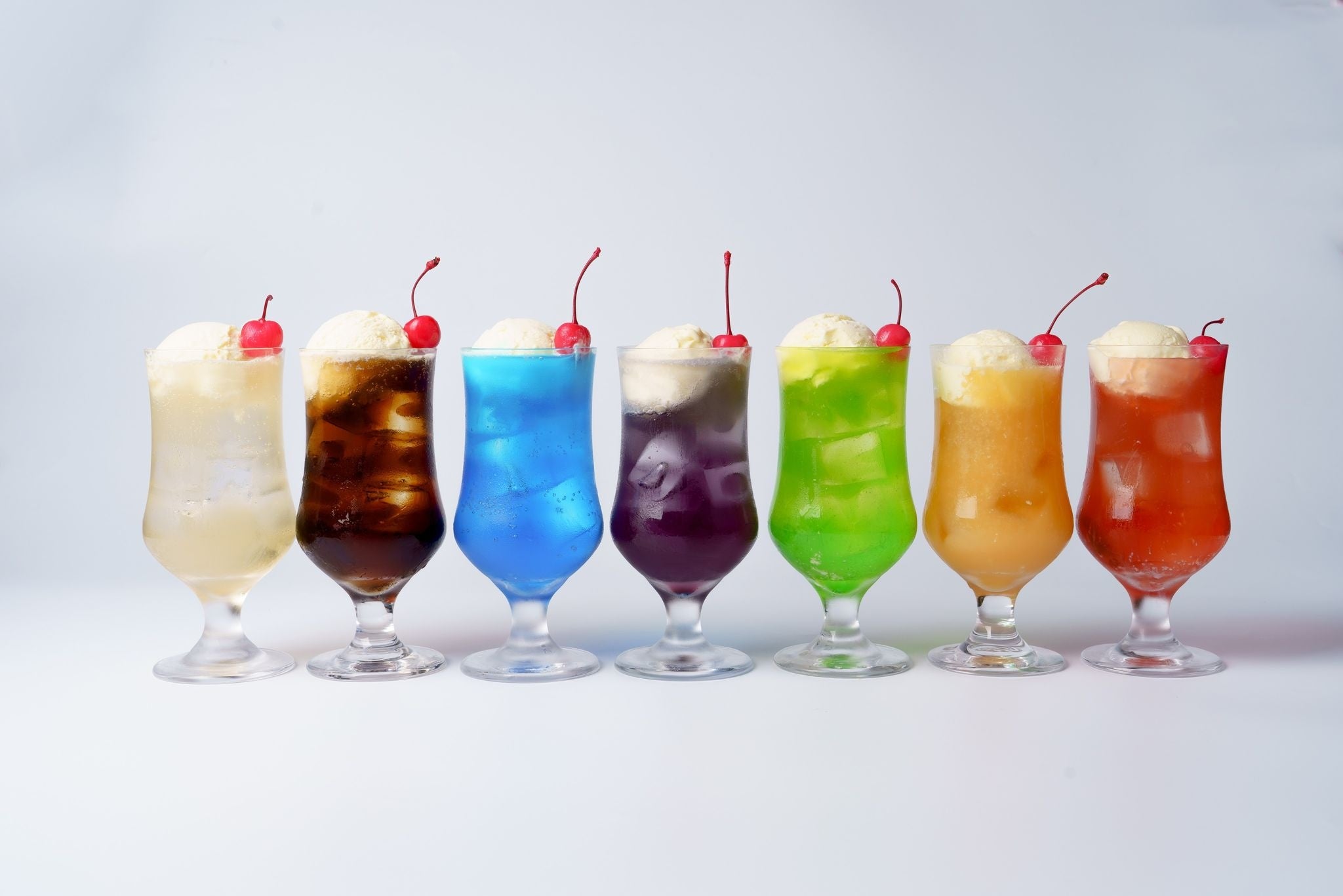 ソーダやジュースの上に、クラシカルなバニラアイスクリームとチェリーをトッピングし、華やかに仕上げた7色のカラフルフロート。いま話題の“推し色スイーツ”としてもお楽しみいただけます。(写真左から、マンゴー、コーラ、シトラス、シトラスベリー、キウイ、オレンジ、ラズベリー)