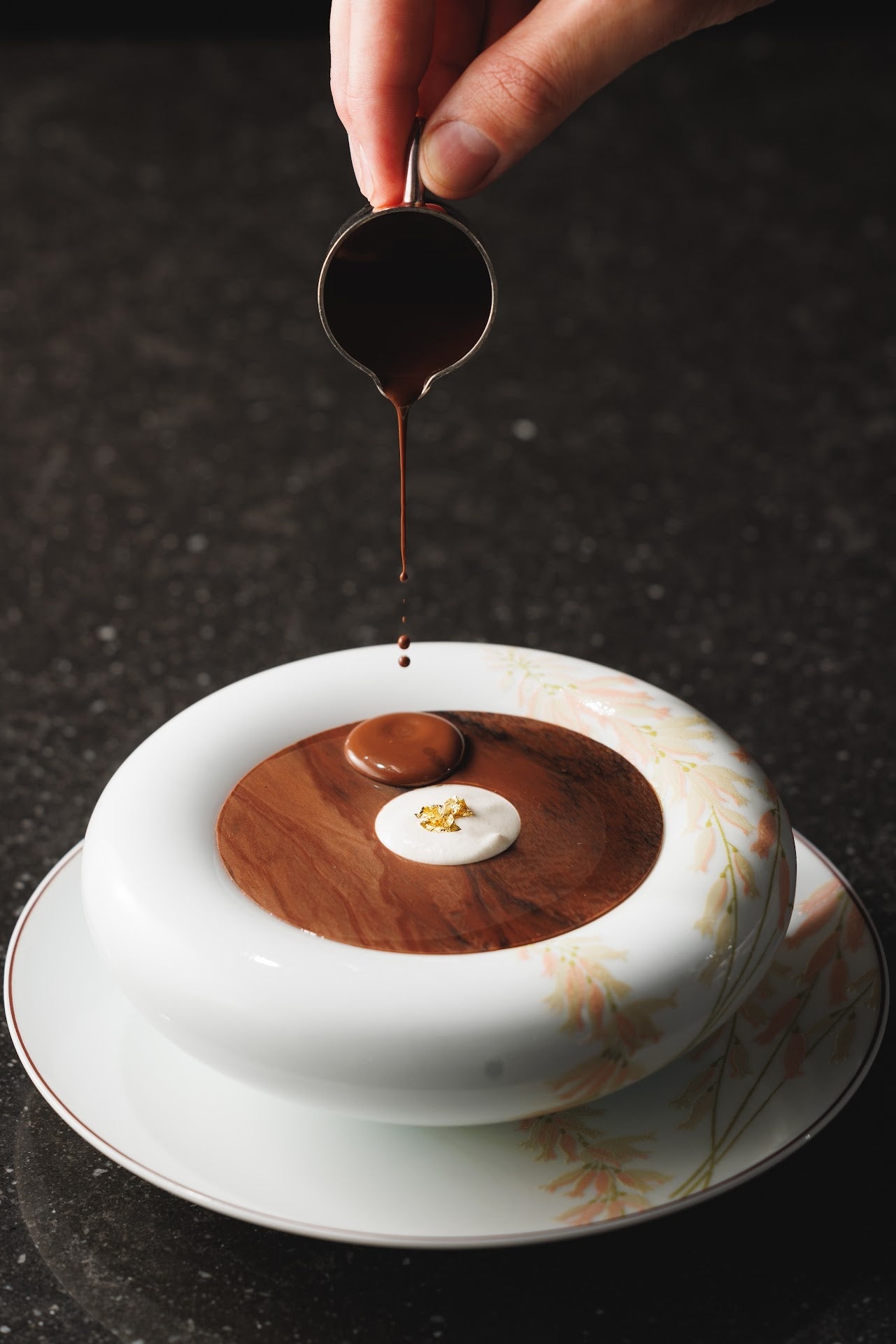 ル・サロンで人気のデザートがリニューアル。マーブル柄の薄いショコラのディスクに温かいショコラソースをかけると、冷たいコーヒー風味のグラニテとクリーム、そしてショコラアイスが現れます。コーヒーとヘーゼルナッツのザクザクとしたショコラやプラリネも加わり、食感も楽しめる一皿です。