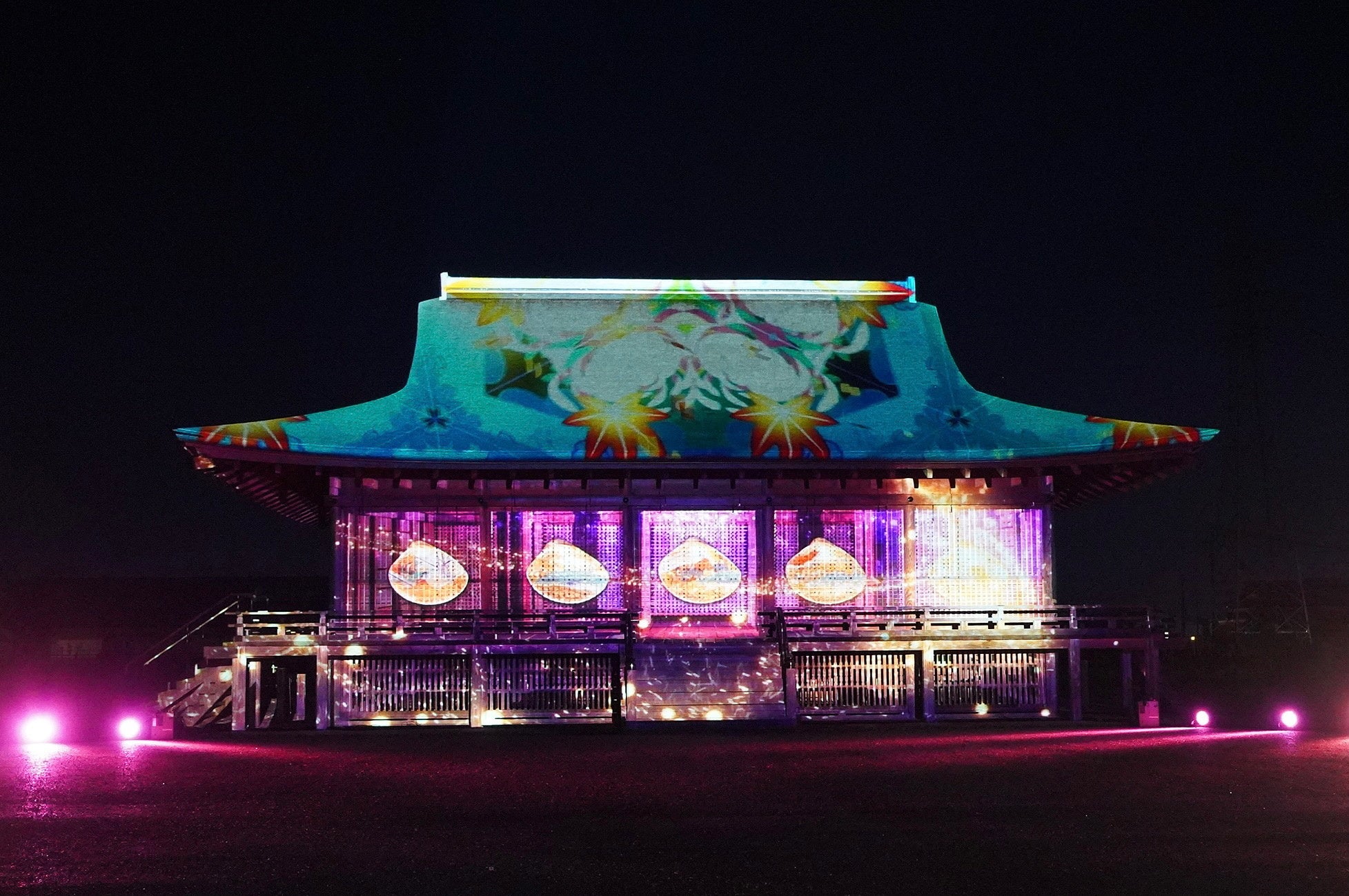 【内容】 かつて斎王が暮らした宮殿の遺跡、国史跡斎宮跡にある「さいくう平安の杜(もり)」の正殿・東脇殿・西脇殿に斎宮歴史博物館が保有する「斎王群行絵巻」や「伊勢物語図屏風」、「源氏絵合わせ貝」などをモチーフとした豪華絢爛な斎王の物語や現代的なデジタルアートなどのプロジェクションマッピング映像を投影しました。