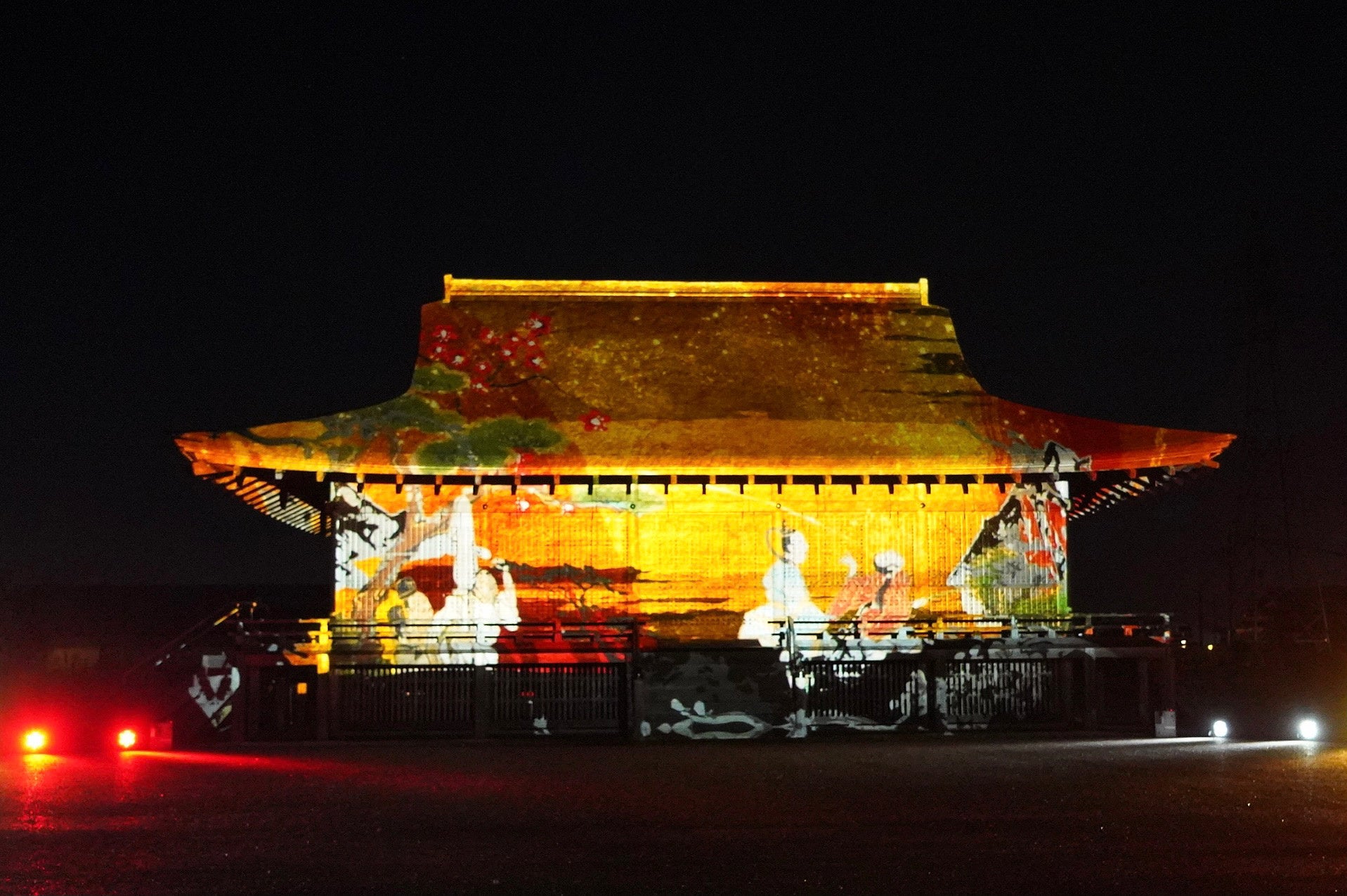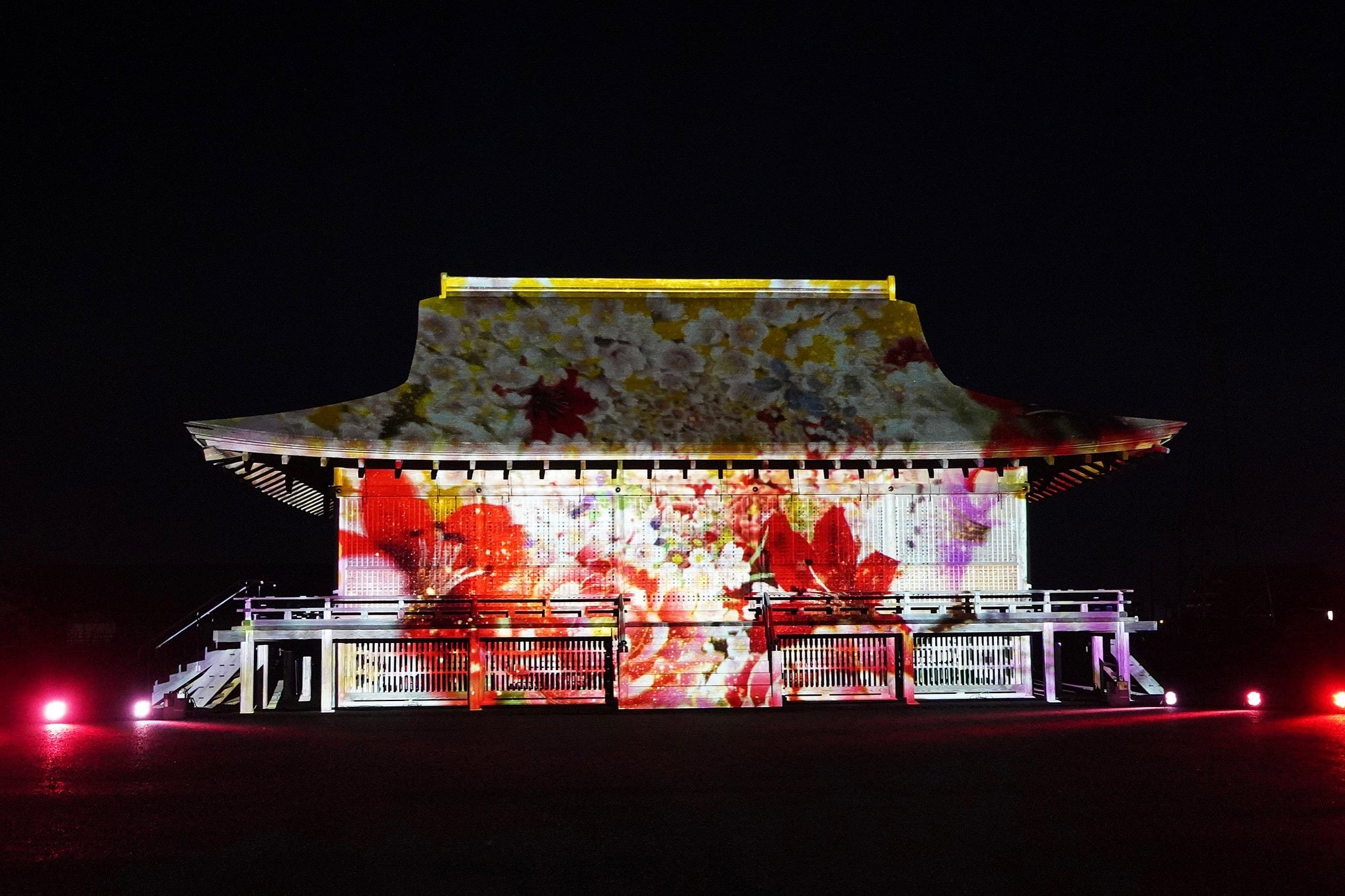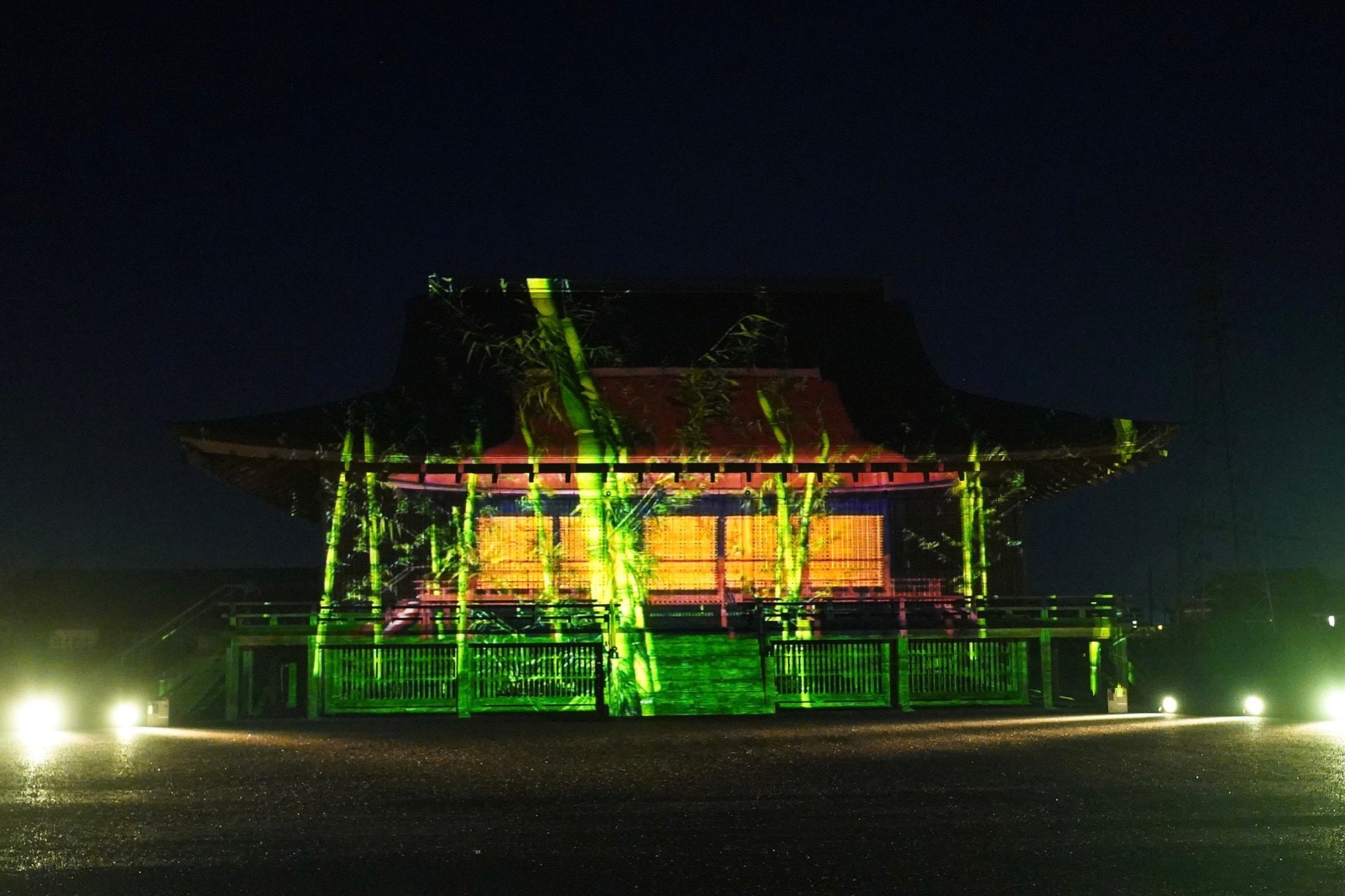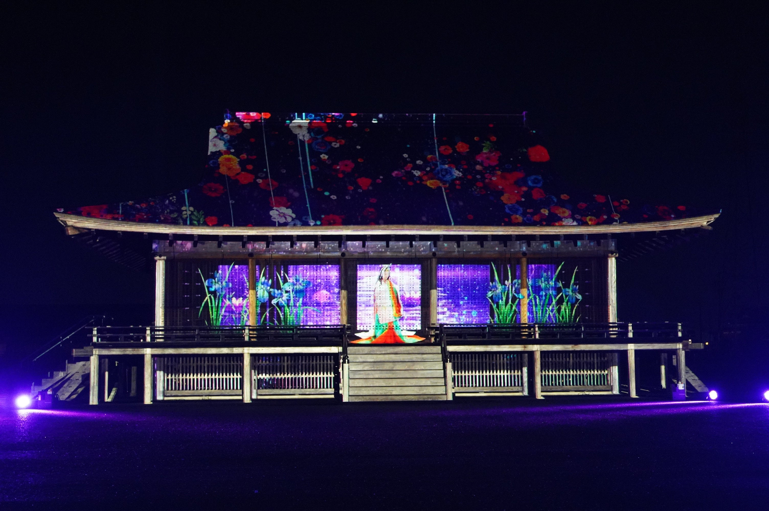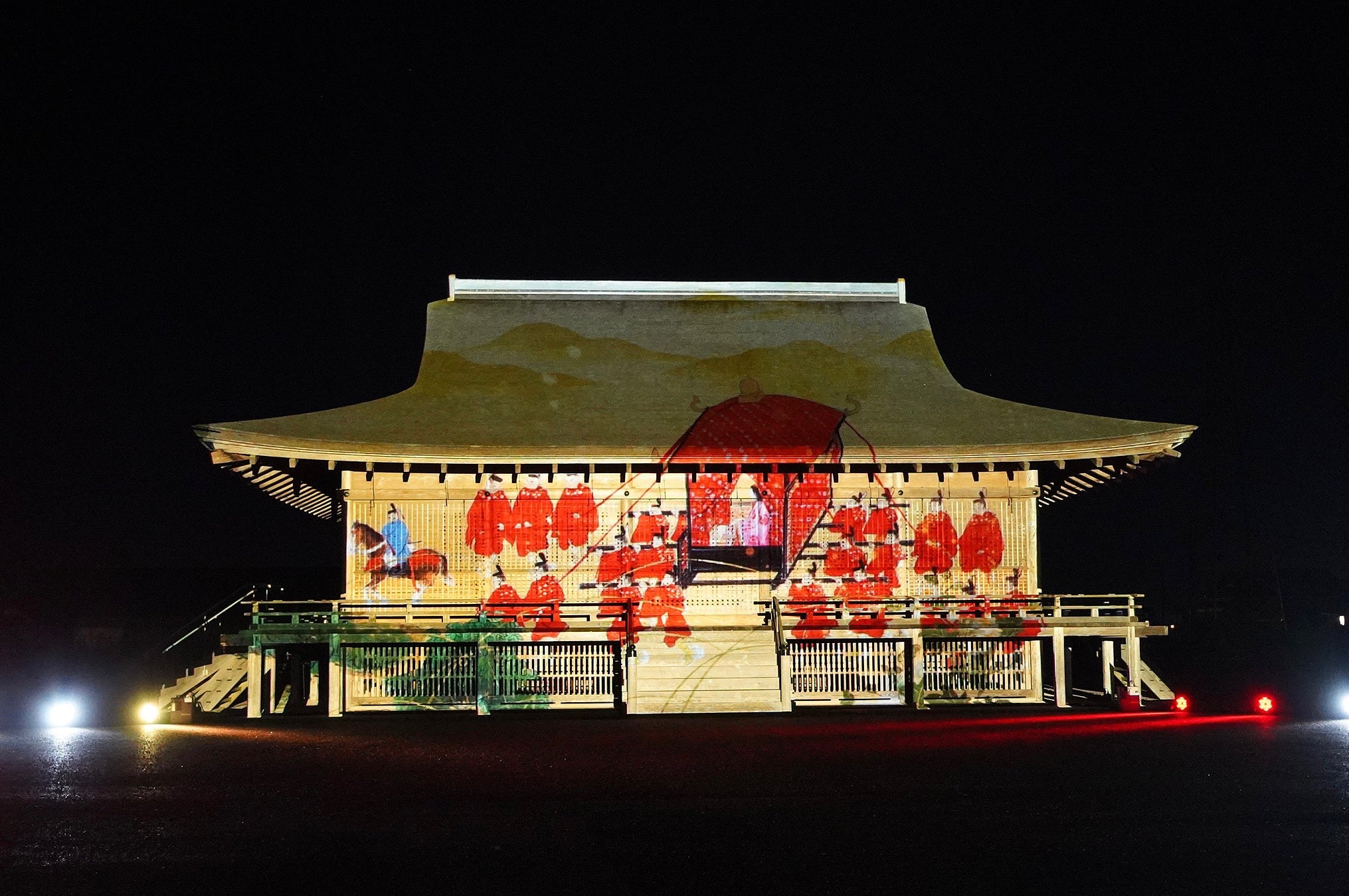 かつて斎王が暮らした宮殿の遺跡、国史跡斎宮跡にある「さいくう平安の杜(もり)」の正殿・東脇殿・西脇殿に斎宮歴史博物館が保有する「斎王群行絵巻」や「伊勢物語図屏風」、「源氏絵合わせ貝」などをモチーフとした豪華絢爛な斎王の物語や現代的なデジタルアートなどのプロジェクションマッピング映像を投影しました。