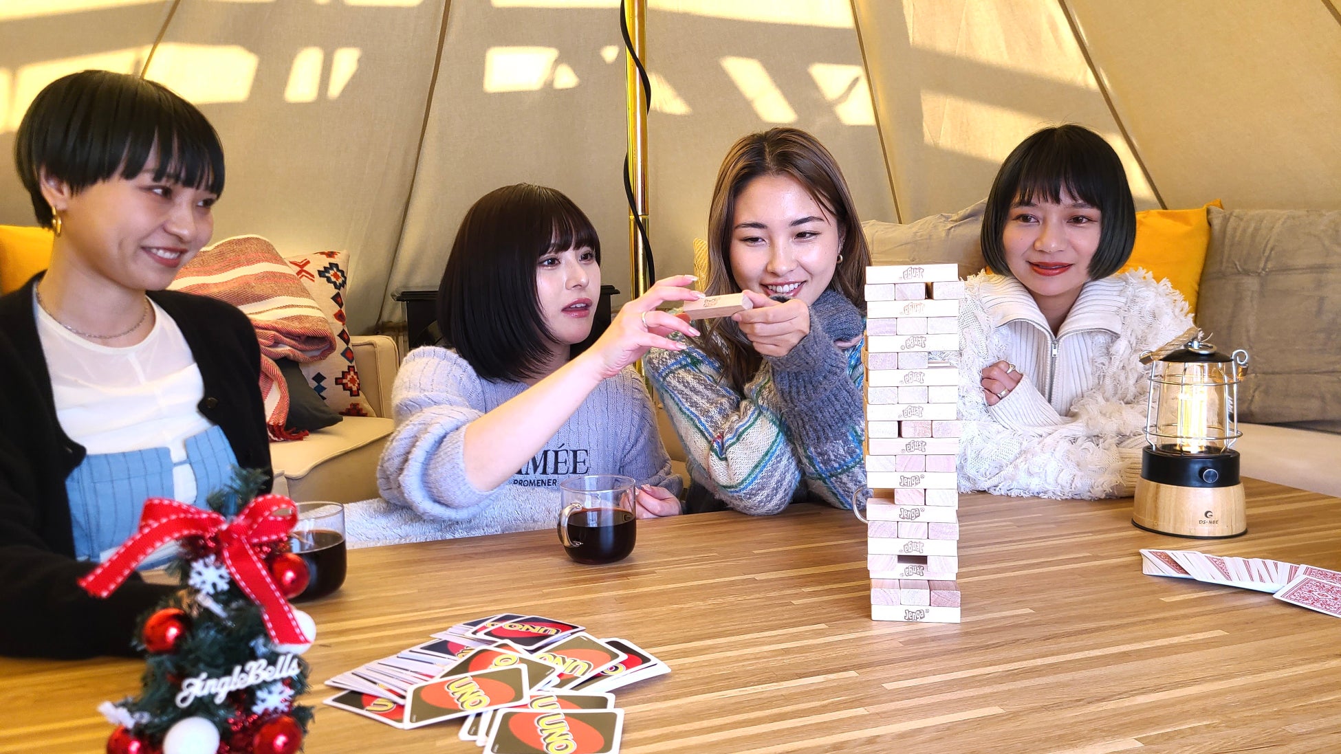 この度はさらなる良質な体験の提供を目指し、都内近郊で非日常空間が体験できる「SKY CAMP AREA」で、グランピングをスタートしました。料金は一律のため、大人数でご利用いただくとよりお得にお楽しみいただけます。テント内には電気ストーブ、こたつをご用意しておりますので、真冬でも十分暖かく過ごせます。また、無料でジェンガやトランプカード、UNOなど時間を忘れるほど没頭できるボードゲーム類も貸し出しいたします。日帰りしやすい横浜駅から徒歩5分の立地で、特別な体験をお楽しみください。