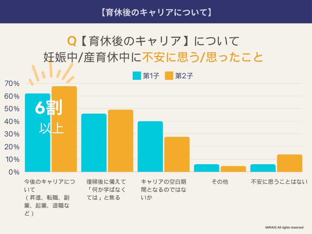 「育休後のキャリアについて妊娠中/産・育休中に不安に思う/思ったことについて教えてください(複数回答)」と質問したところ、第1子の産・育休者、第2子以降の産・育休者ともに6割以上が「今後のキャリアについて(昇進、転職、副業、起業、退職など)」の進展を不安に思っていることがわかりました。次いで「復帰後に備えて『何か学ばなくては』と焦る」が第1子、第2子以降の産・育休者ともに4割を超える回答となりました。