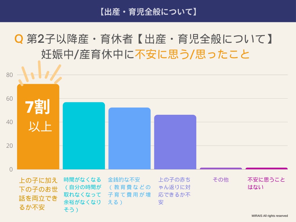 「出産・育児全般について、妊娠中/産・育休中に不安に思う/思ったことについて教えてください(複数回答)」と質問したところ、第1子の産・育休者のうち、「出産についてわからないことだらけ」「育児についてわからないことだらけ」と回答した人がともに5割以上と、未経験のことに対する不安が示されました。また、第2子以降の産・育休者の7割が「上の子に加え下の子のお世話を両立できるか不安」と回答しました。さらに、両者とも、約半数が子育て費用が増えることによる金銭的な不安や、子育てによって自分の時間が取れなくなることに対する不安を感じているという回答となりました。