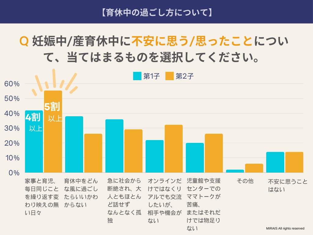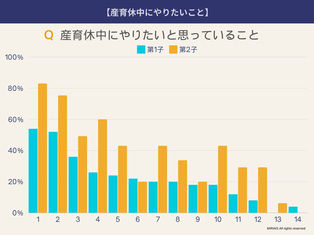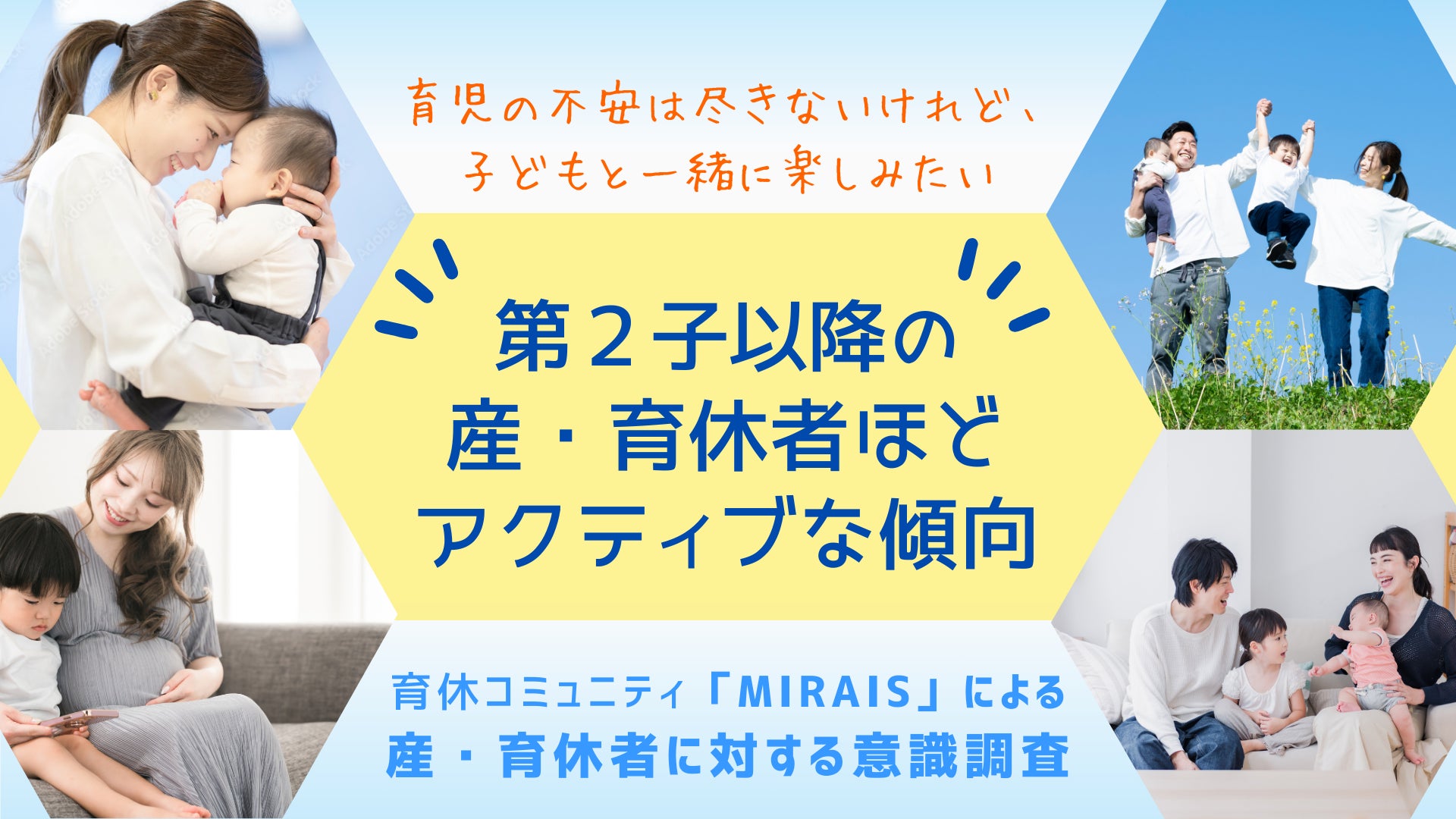 「なんとなく育休」をなくしたいを目標に活動する、育休コミュニティ「MIRAIS」(代表 栗林真由美、以下MIRAIS)は、産・育休取得予定者及び産・育休者115名に対し、産・育休中における意識調査を実施しました。その結果、第1子の産・育休者、第2子以降の産・育休者ともに子育てに対する不安はある一方で、第2子以降の産・育休者の方が、産・育休中に取り組みたいことが多い傾向であることがわかりました。